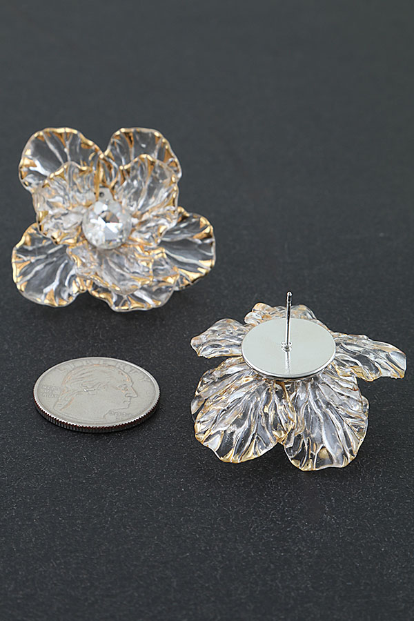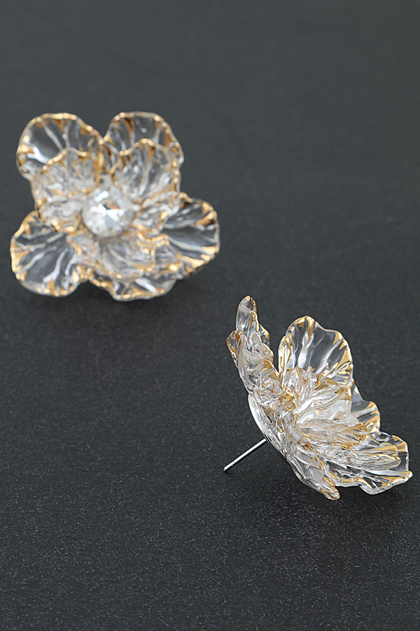 • * These Transparent Gold Flower Earrings from H&D Accessories feature a delicate floral design with translucent, textured petals trimmed in shiny gold, centered by a single sparkling stone. Their elegant, ethereal style is perfect for adding a refined touch to formal occasions or elevating everyday office attire. Crafted with meticulous detail, they offer both timeless beauty and versatile wearability for any special moment.