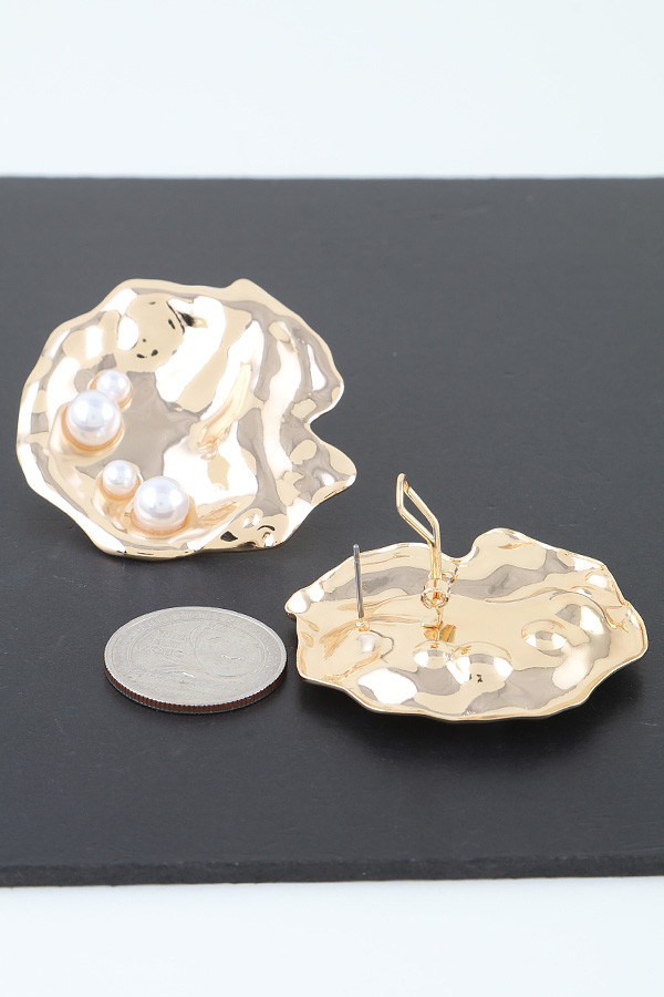 - * These Ripple Pearl Puddle Earrings from H&D Accessories showcase a unique and artistic design. The earrings feature a textured, ripple - like surface that mimics a puddle, giving them a fluid and organic appearance. Nestled within the rippled metal are lustrous pearls, adding a touch of elegance and contrast to the overall look. The combination of the modern, abstract metalwork and the classic pearls creates a harmonious blend of contemporary and timeless elements.