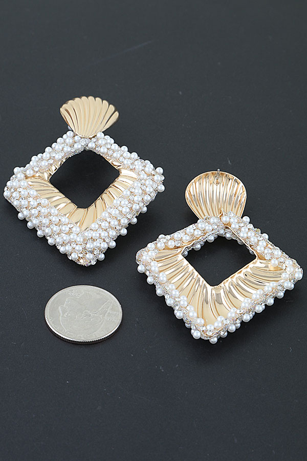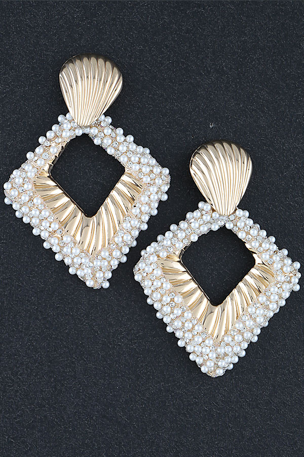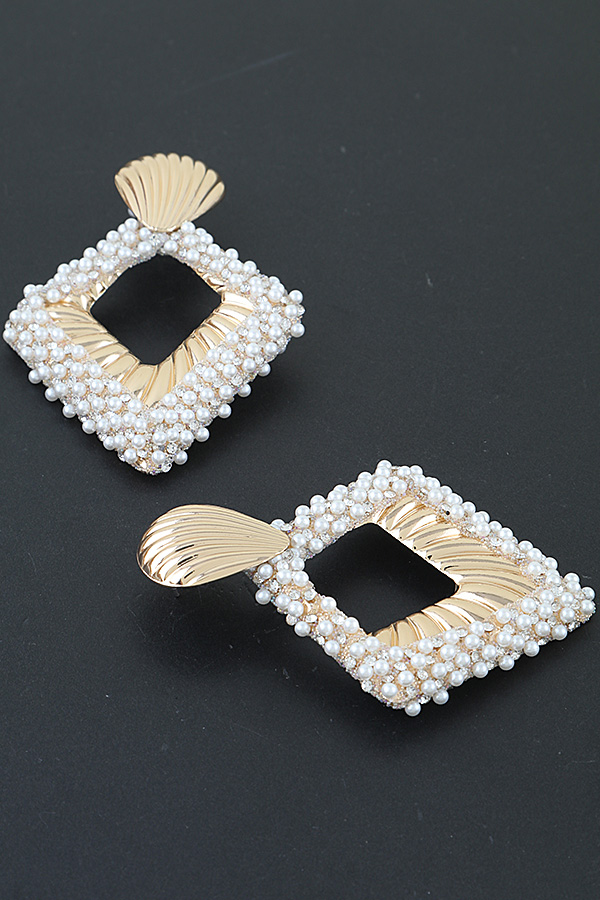 - * These Pearl Embedded Diamond Cut Drop Earrings from H&D Accessories feature a sculpted, ribbed top accent anchoring a bold, open geometric frame, densely adorned with lustrous beads. Their structured, beaded design adds a glamorous, refined touch to any ensemble. Wear them to elevate a tailored blouse for a daytime brunch or to complement a formal gown at an evening gala. The intricate beading ensures a luxurious presence, making them a striking choice for both casual and special occasions.