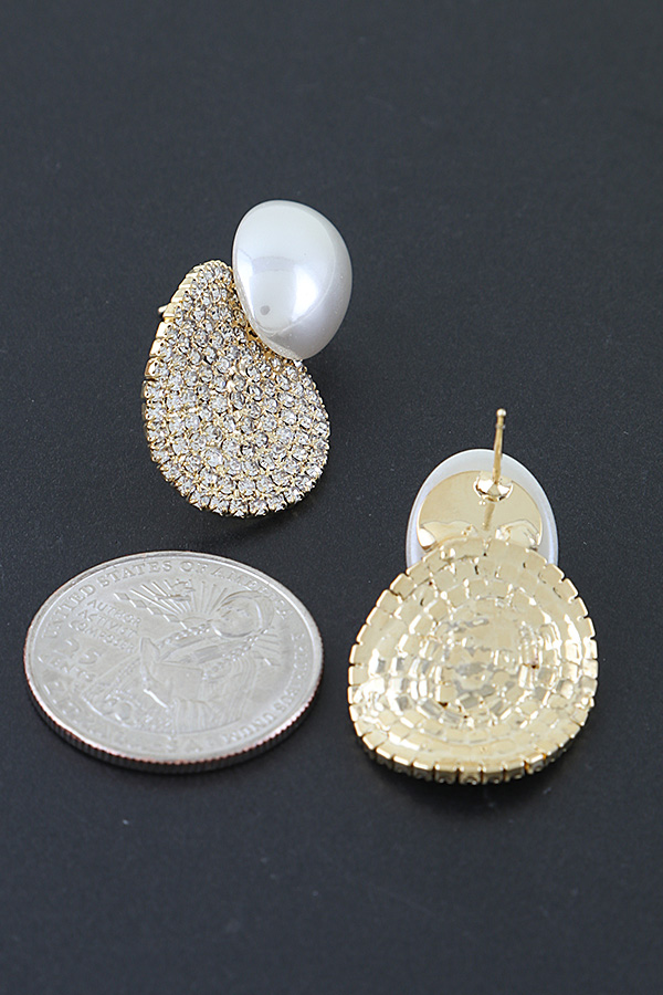 - * These Bejeweled Pearl Disc Drop Earrings from H&D Accessories feature a smooth, oval focal bead atop a dense, stone-encrusted circular disc, creating a layered, luxurious design. Their dual-textured, bejeweled appearance adds a refined, glamorous touch to any ensemble. Wear them to elevate a simple blouse for a daytime brunch or to complement a formal gown at an evening soiree. The intricate stone detailing ensures a striking presence, making them a versatile choice for both casual and special occasions.