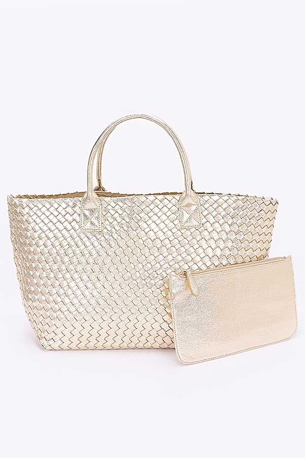 Metallic Faux Leather Braided Tote Bag