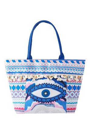 EVIL EYE BOHO PRINT POM POM FRINGE TOTE BAG
