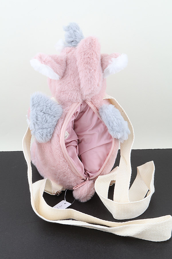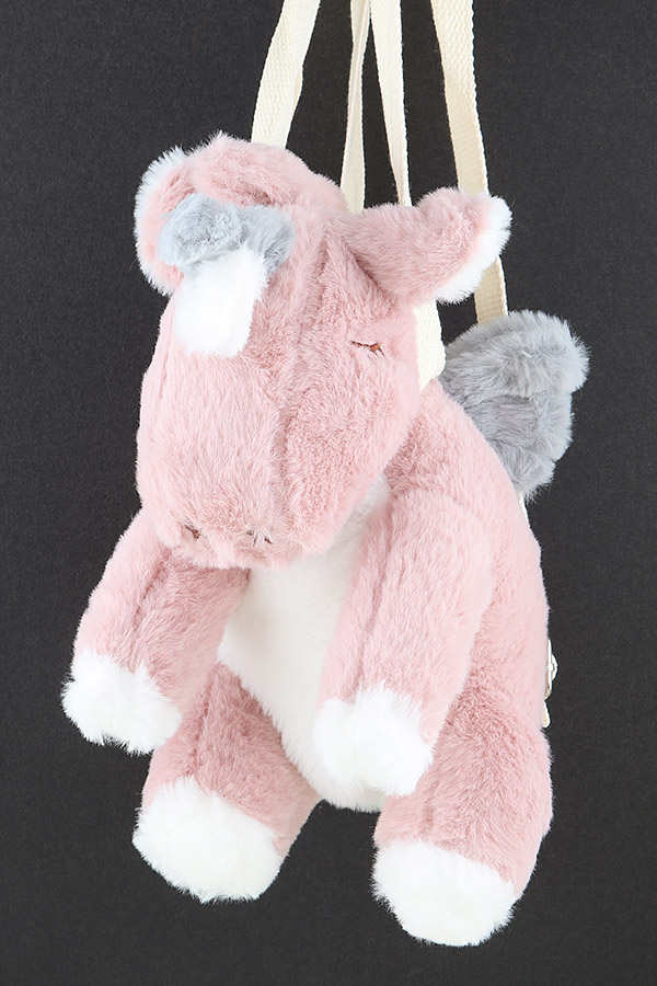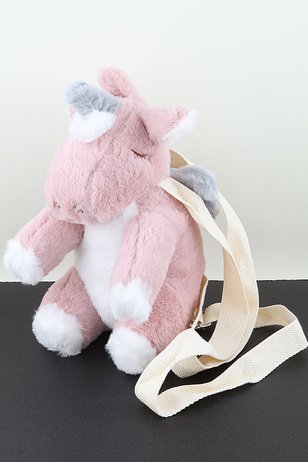 • * This is the Sleepy Unicorn Fur Backpack from H&D Accessories. It is designed in the shape of a cute, resting unicorn, crafted with soft, plush material. The unicorn features a serene expression with closed eyes, a small horn, and delicate wings, all adding to its charm. It comes with a sturdy, adjustable shoulder strap, making it both functional and adorable.