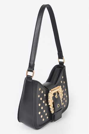 Faux Leather Studded Metal Buckle Shoulder Bag