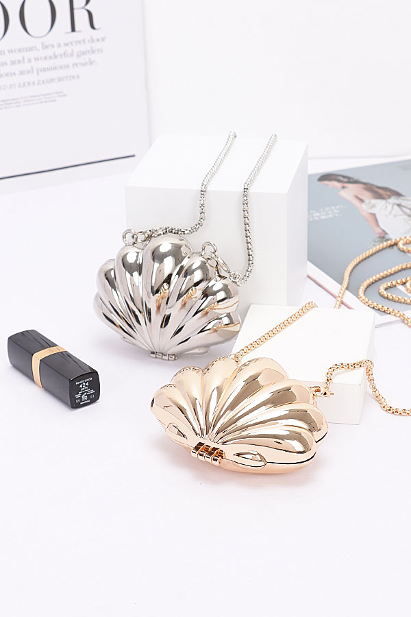 - * Introducing the "Metal Mini Clutch" – a stunning piece that captures the essence of elegance and sophistication. This shell-shaped clutch, paired with a delicate chain, is perfect for those who want to make a statement. Elevate your evening look with this must-have mini clutch from H&D Accessories.