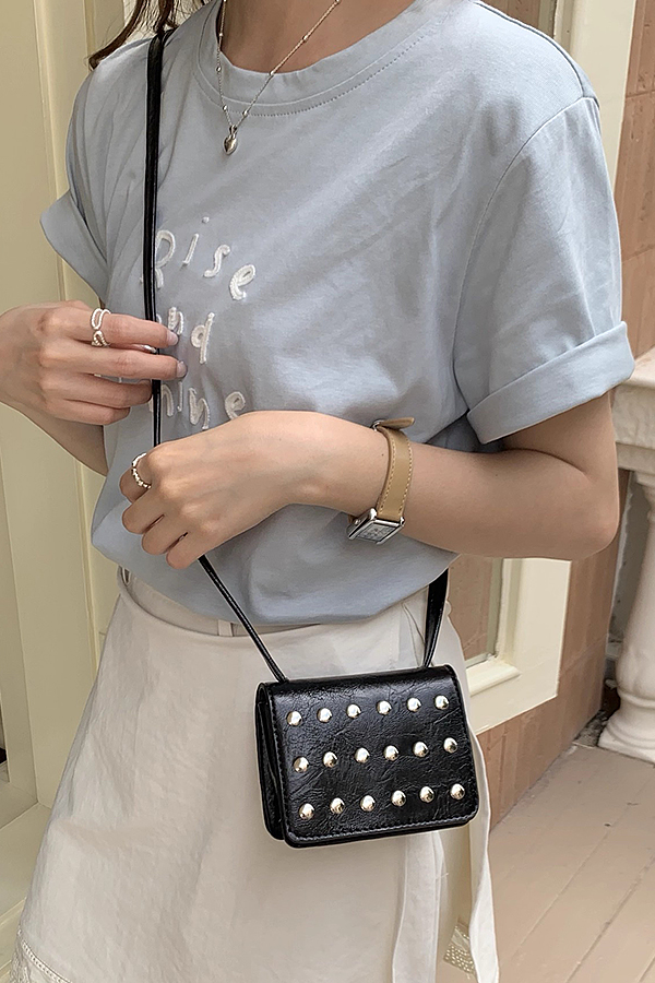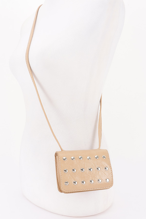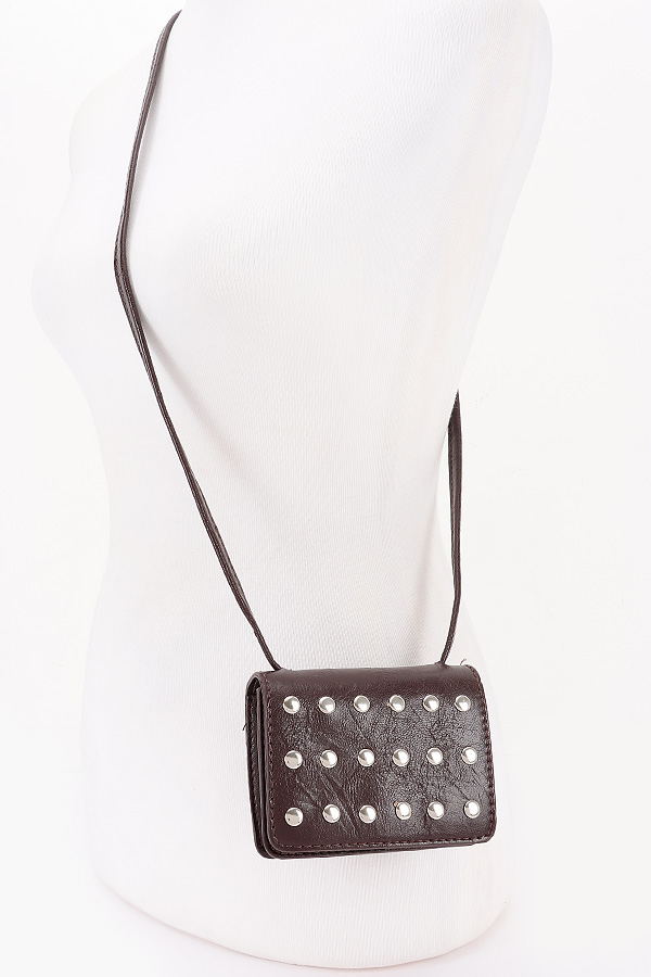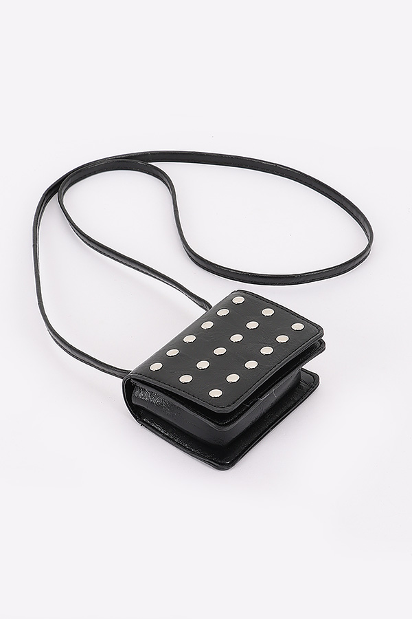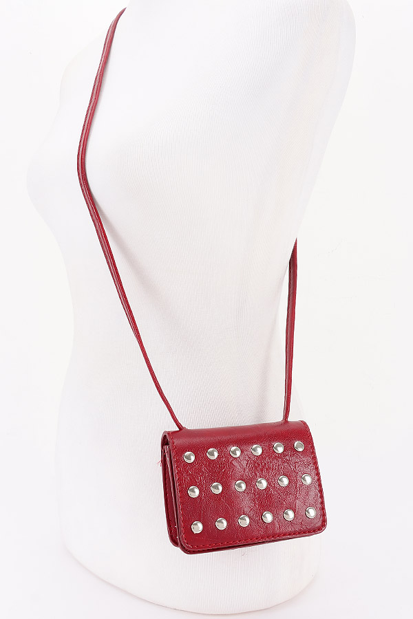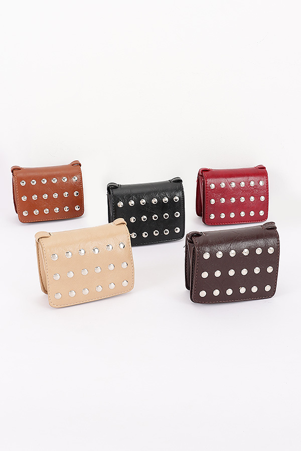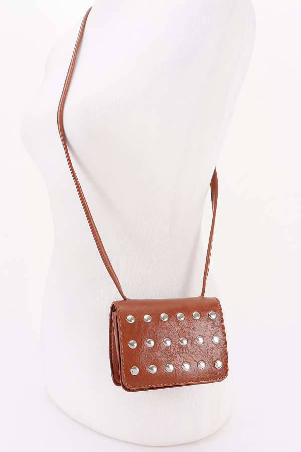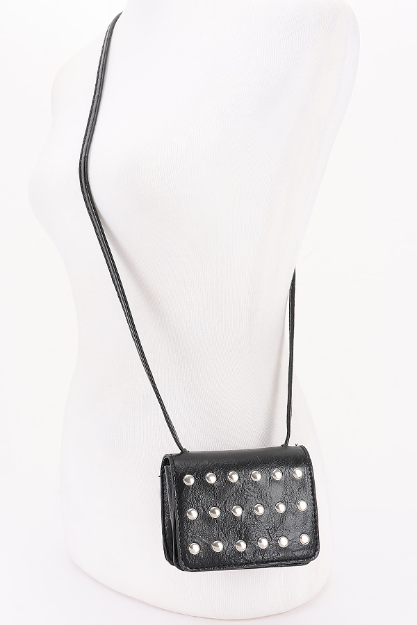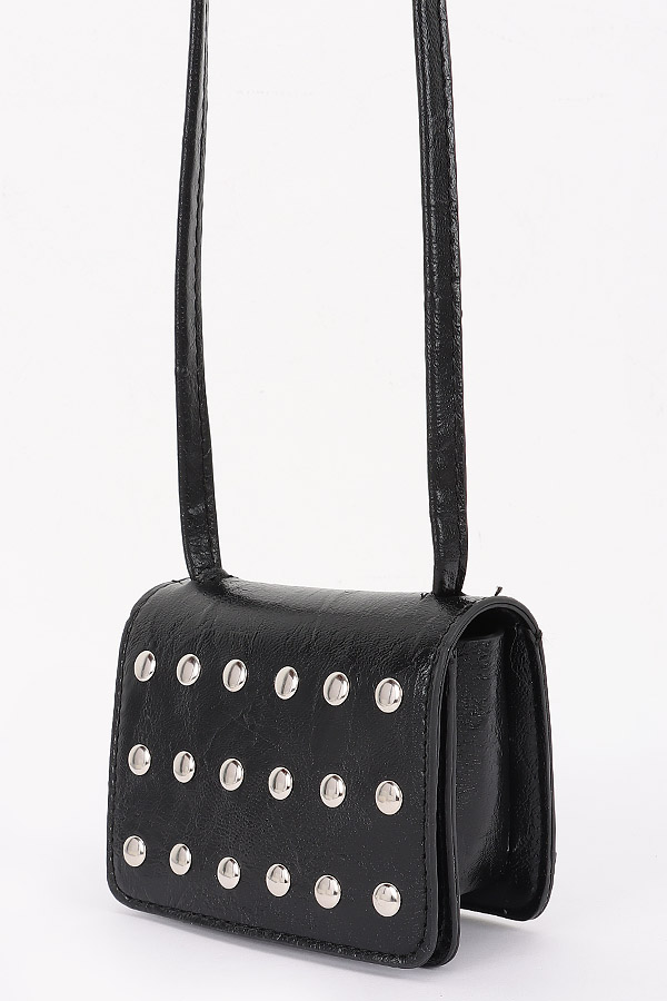 - * This Faux Leather Metal Studded Mini Bag from H&D Accessories features a compact design with metal studs adorning the faux leather surface. It comes with a slender crossbody strap, offering both style and convenience.