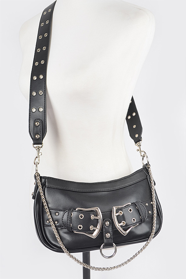 • * Introducing the "Urban Edge Buckle Bag" – a striking fusion of style and functionality. This faux leather purse, adorned with bold metal buckles and chains, is perfect for the modern trendsetter. Elevate your accessory game with this statement piece that effortlessly complements any outfit.