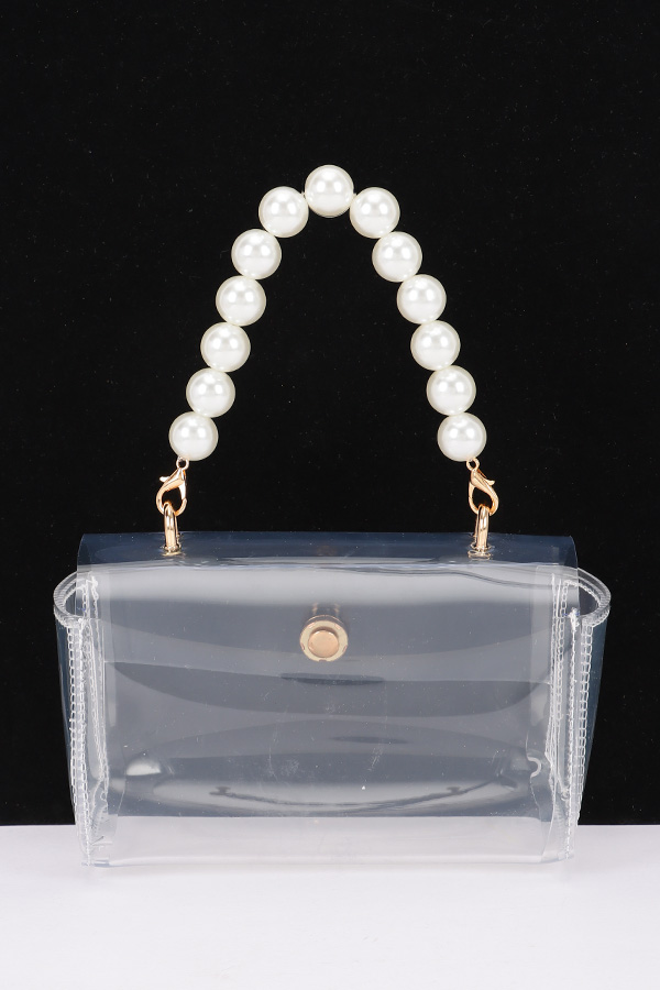 - * This is a Transparent Pearl Handle Flap Bag from H&D Accessories, featuring a delicate beaded handle and an chain strap for versatile styling. It has a secure flap closure to keep small essentials organized. Perfect for daytime events like brunch dates or garden parties, it adds a soft, elegant touch to light, casual outfits. Its sleek, see-through design blends charm with practicality, making it a stylish companion for relaxed, refined occasions.