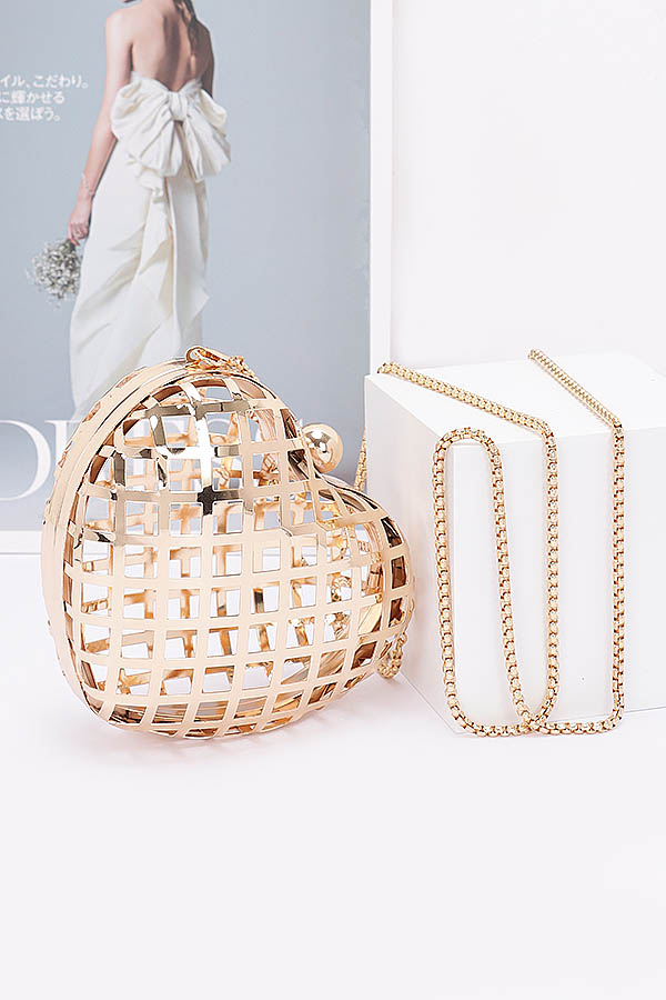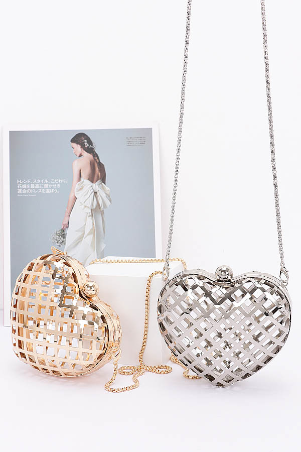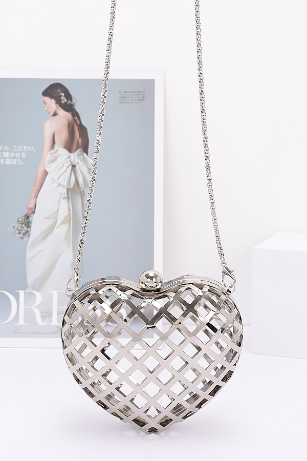 - * Introducing the "Metal Heart Shape Mini Clutch" – a stunning heart-shaped bag that radiates elegance and charm. Perfect for any occasion, this mini clutch from H&D Accessories is designed to make a statement. With its hollow out design and chic chain, it's not just a bag, it's a symbol of love and style.