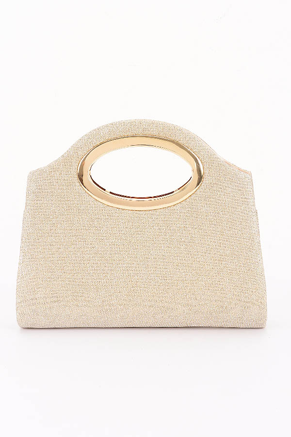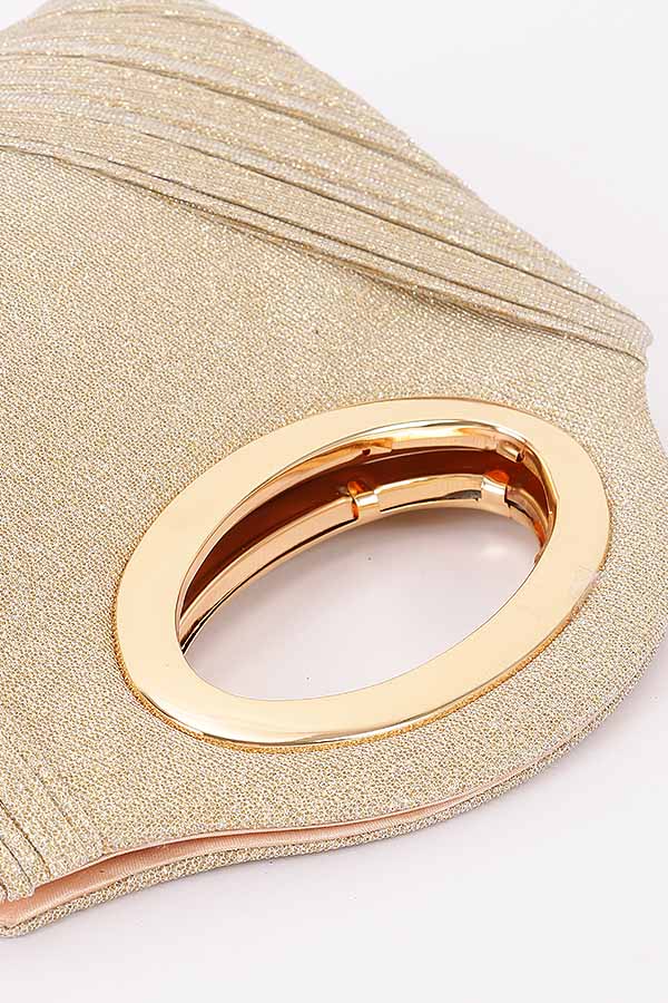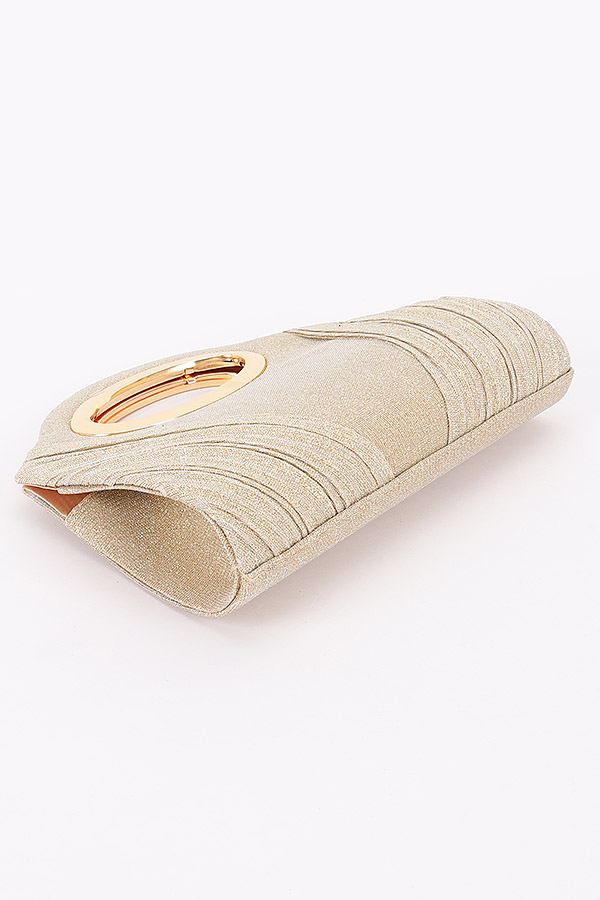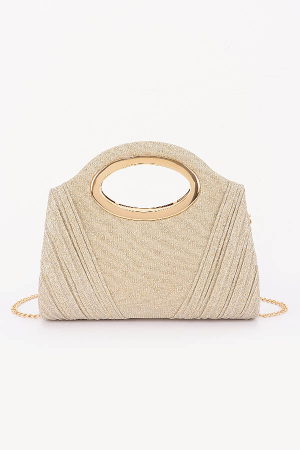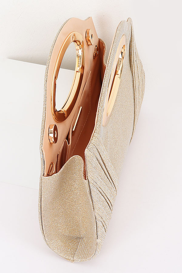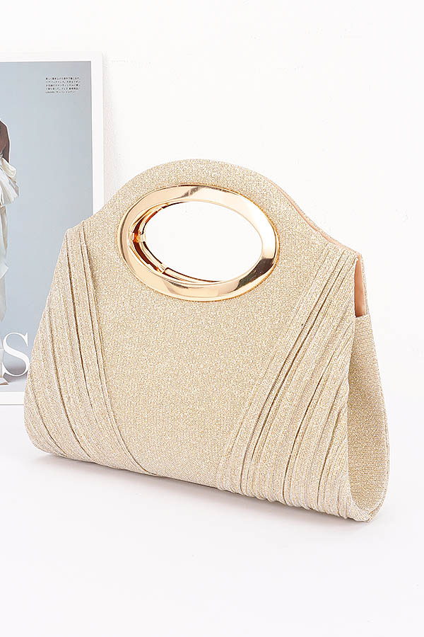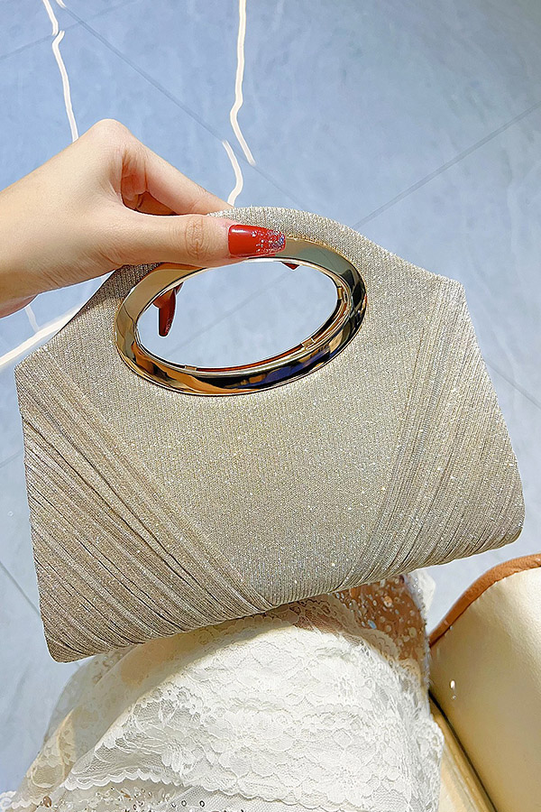 - * This is a Glitter Metal Handle Party Clutch from H&D Accessories. Crafted from glitter - textured fabric, it features a curved, structured silhouette with elegant vertical pleats that add depth and dimension to the design. A large, polished metal handle with a circular cutout adorns the top, serving as both a functional grip and a striking decorative element. The clutch is equipped with a detachable chain strap, allowing for versatile carrying options—either handheld via the metal handle or worn crossbody with the chain. The glittery fabric catches the light, creating a shimmering effect that enhances its festive appeal. Ideal for formal events such as evening parties, weddings, or cocktail gatherings, it pairs beautifully with gowns, dresses, or sophisticated evening attire to add a touch of glamour and sparkle.