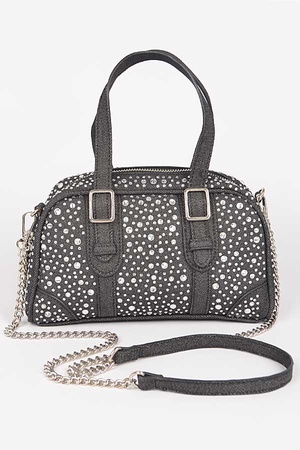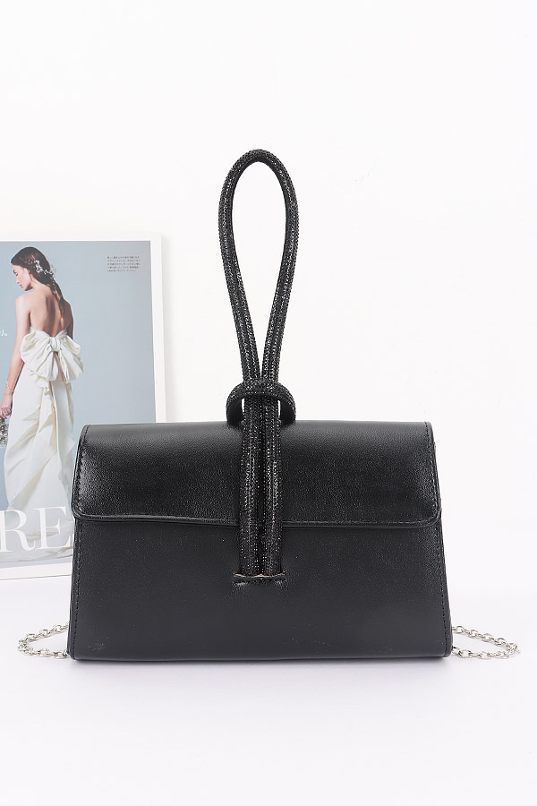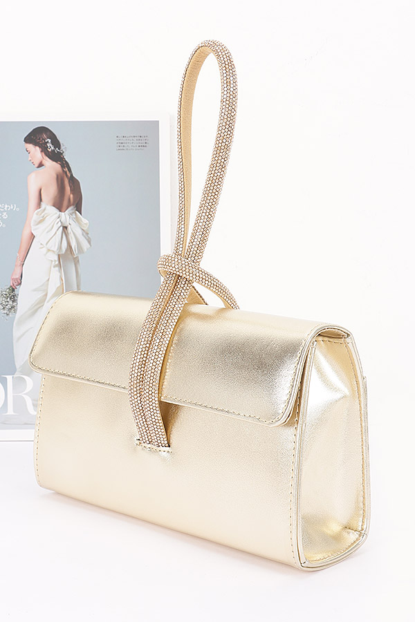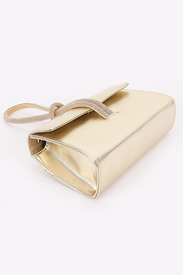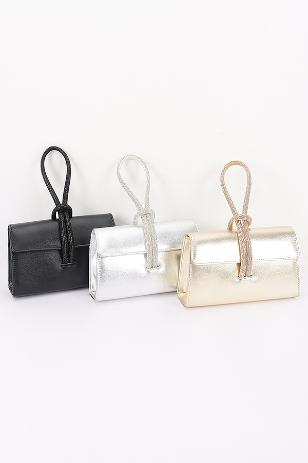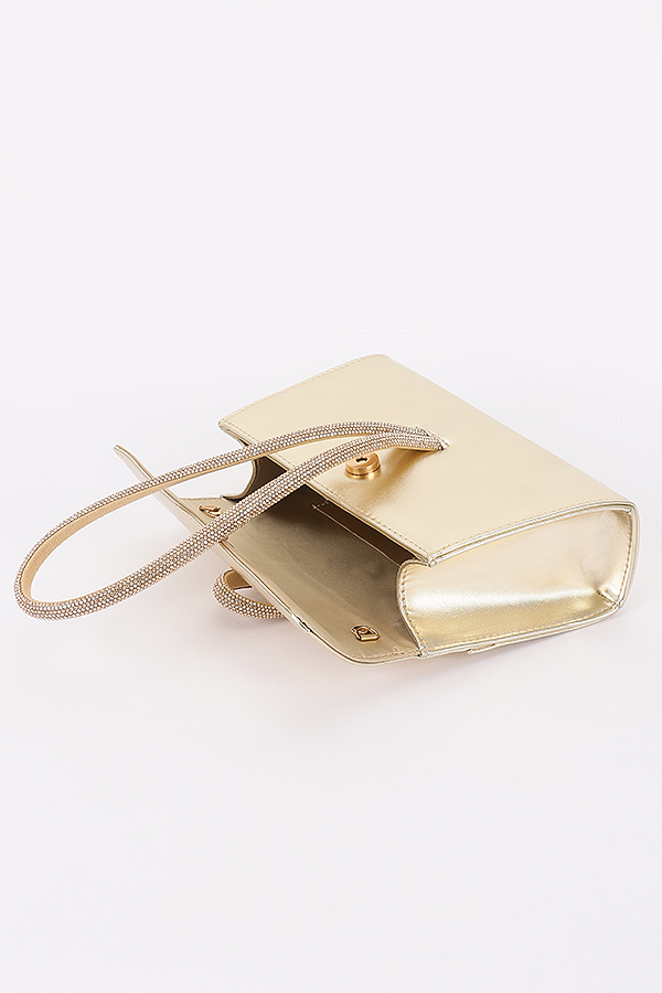 - * Metallic Faux Leather Rhinestone Handle Clutch
