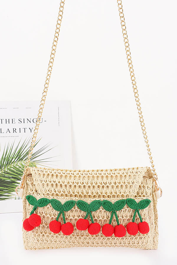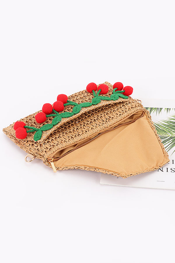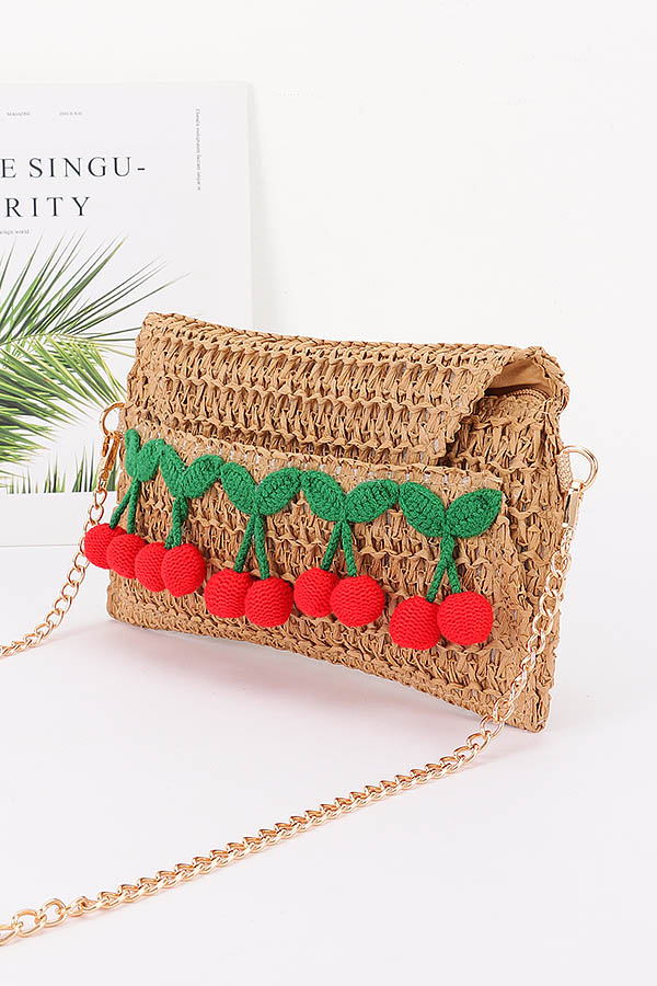 • * This Faux Straw Cherry Clutch from H&D Accessories features a charming design with a faux straw construction and cute cherry embellishments. It comes with a chain strap, allowing for versatile carrying options, and has a playful and stylish appearance.