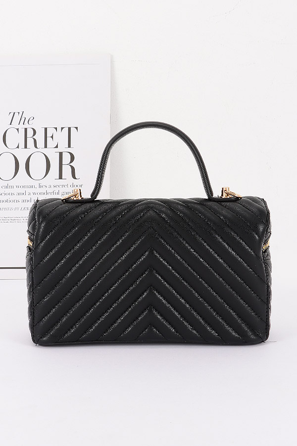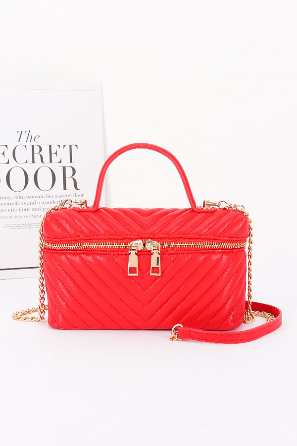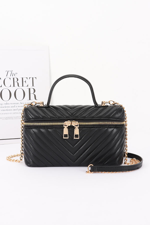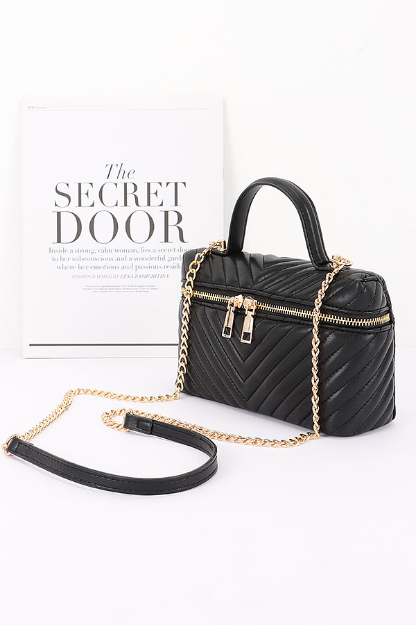 • * This Quilted Vegan Leather Vanity Case Bag from H&D Accessories features a quilted pattern, a top handle, and a chain strap. It has an elegant and stylish appearance, giving it a sophisticated and practical vibe.