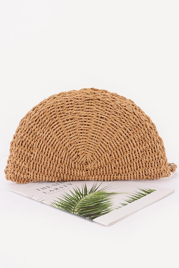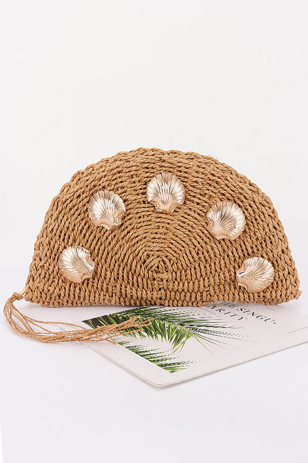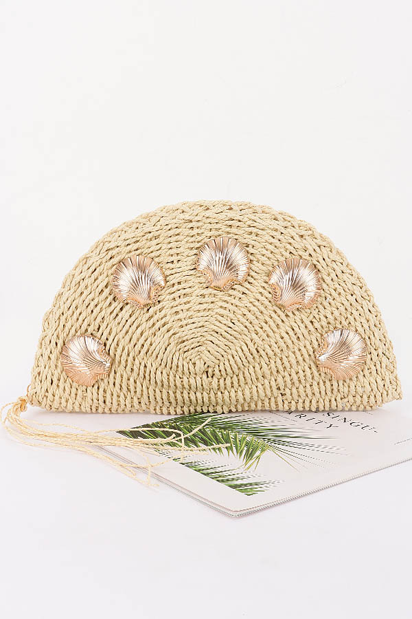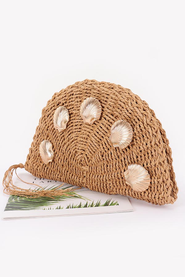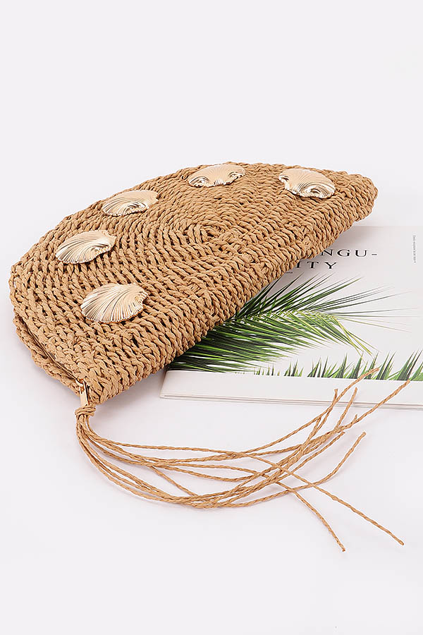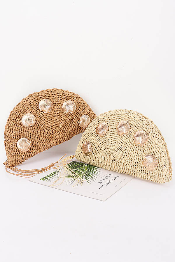 - * Faux Straw Half-Moon Clutch with Shell Embellishments