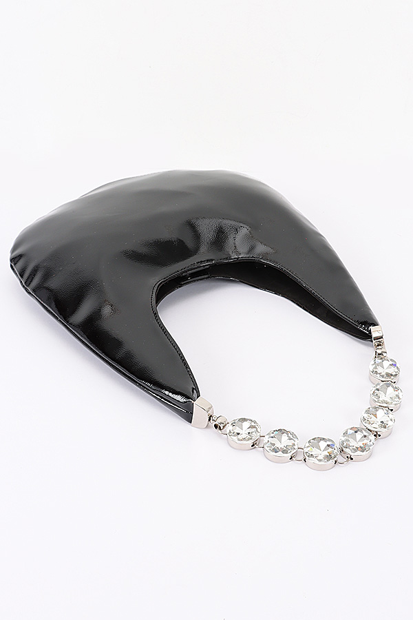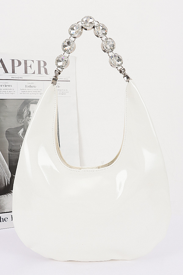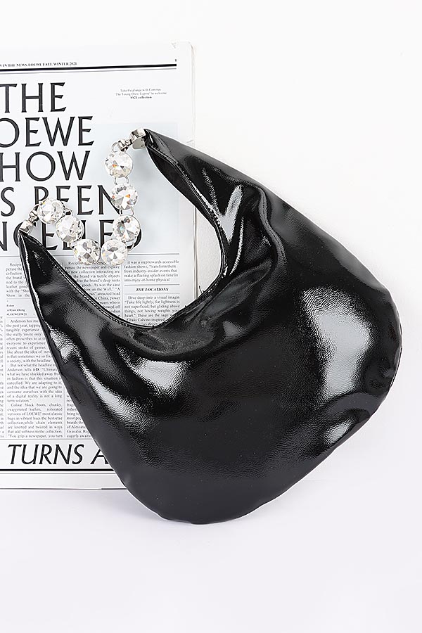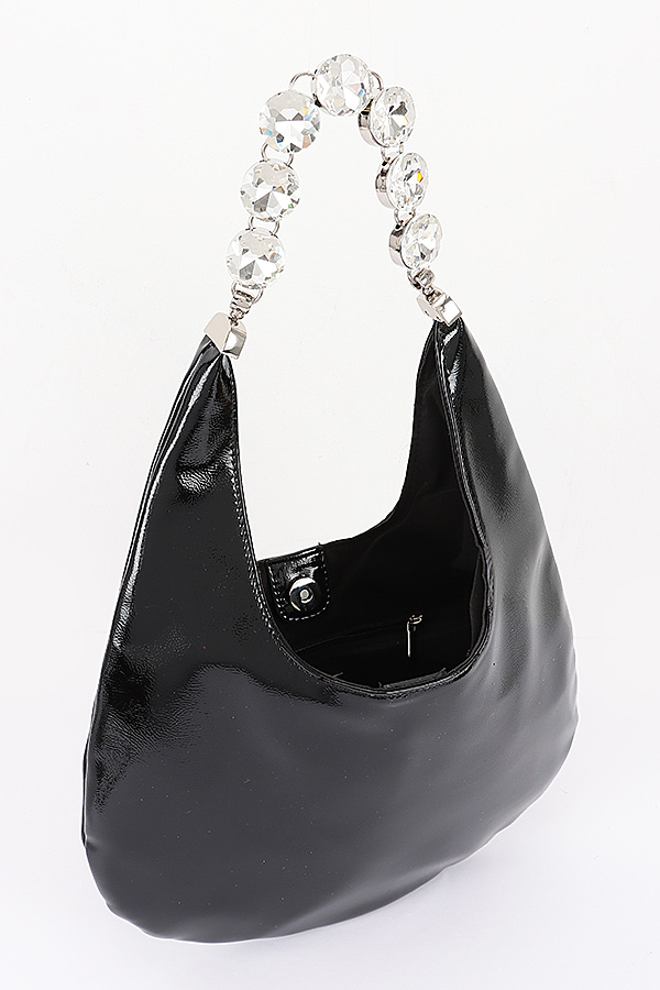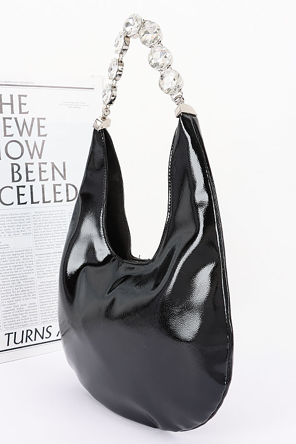 - * This Patent Leather Rhinestone Handle Shoulder Bag from H&D Accessories features a glossy, fluid patent leather exterior with a slouchy, hobo-inspired silhouette, elevated by a striking handle crafted from sparkling, faceted rhinestones that catch the light with every movement. Perfect for a night out with friends, a cocktail party, or a dinner date, it can be carried by the eye-catching rhinestone handle for a glamorous, statement look or slung over the shoulder for effortless everyday wear, offering a spacious interior to hold your essentials while adding a bold, luxurious touch to any outfit.