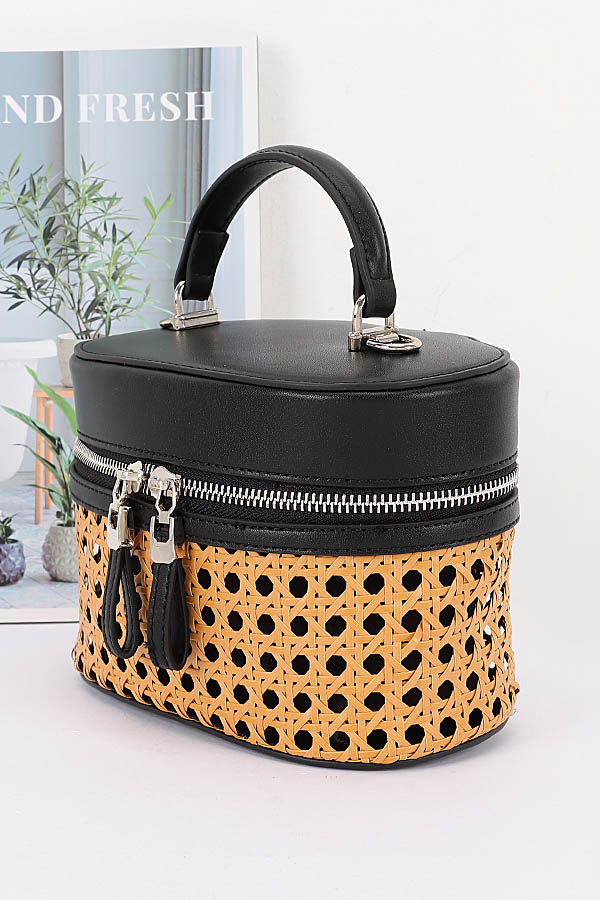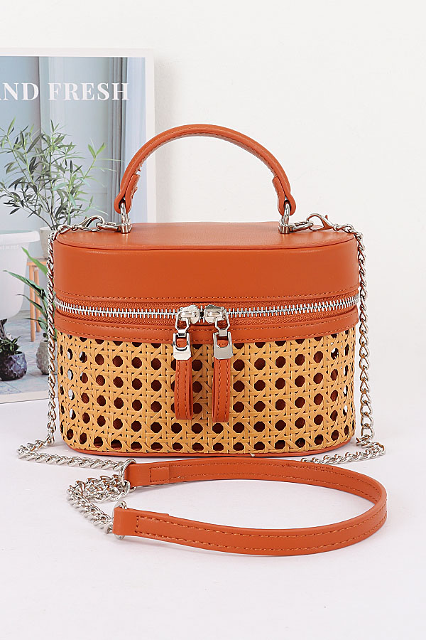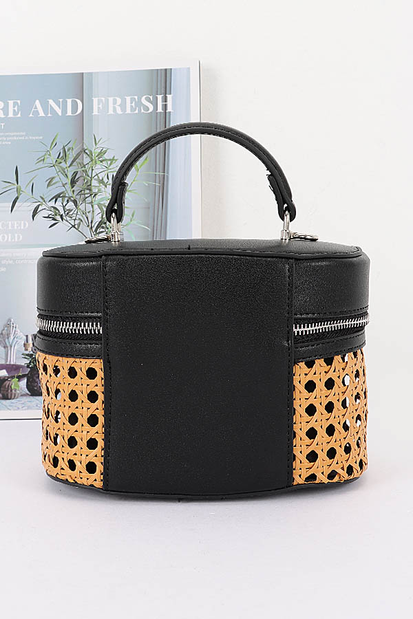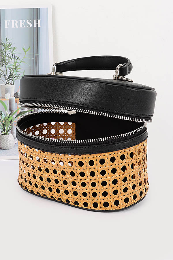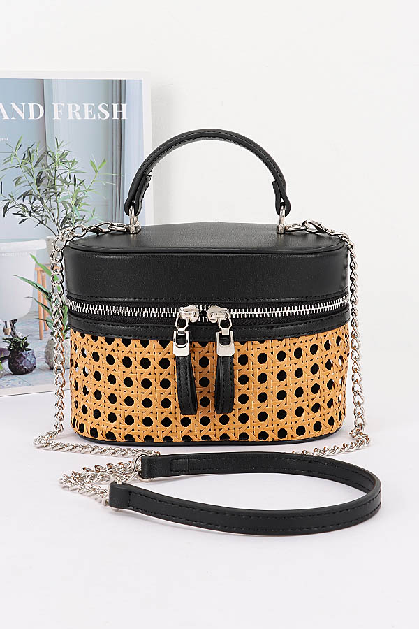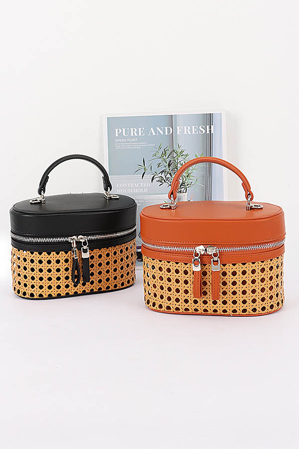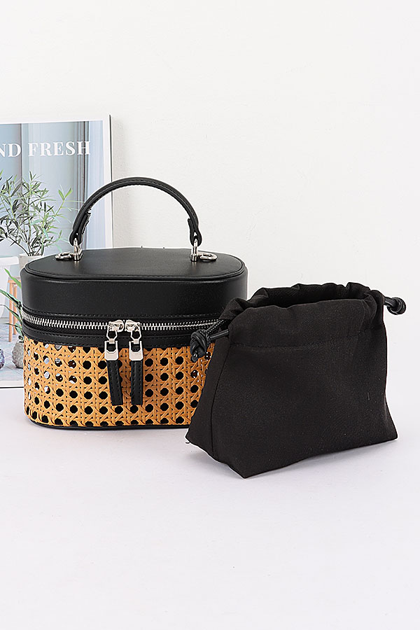 • * This Braided Bamboo Cosmetic Bag from H&D Accessories features a round, dual-texture structure—combining braided material with a smooth, structured fabric. It’s designed with a double-zip closure (for convenient access to contents), a top handle, and a detachable mixed strap (blending chain and solid segments), making it versatile enough to serve as both a cosmetic organizer and a compact daily bag. It boasts a casual yet stylish appearance, exuding a fresh, multi-functional vibe.Ideal for storing makeup, skincare products, or small toiletries during trips, keeping essentials organized and easily accessible.