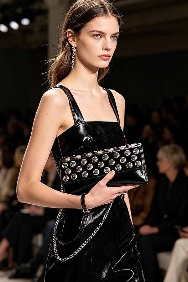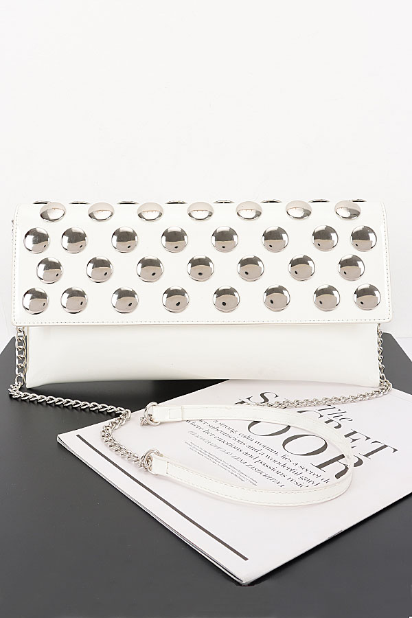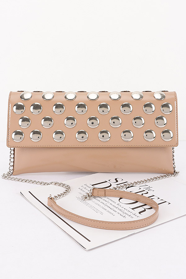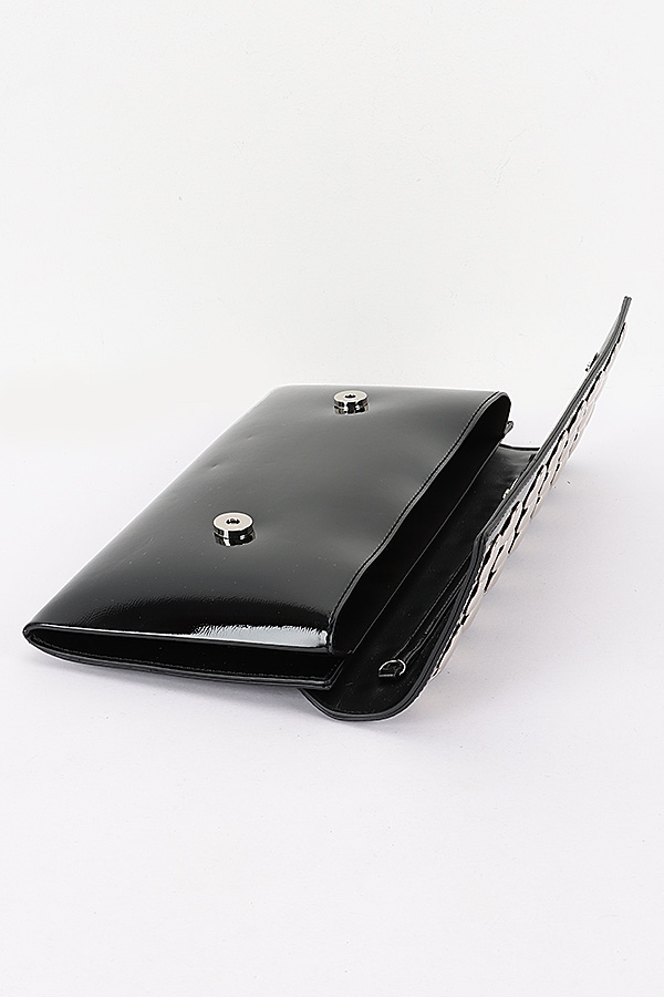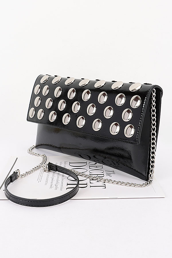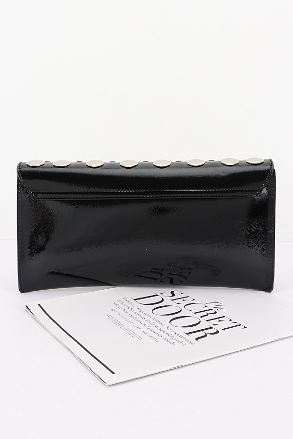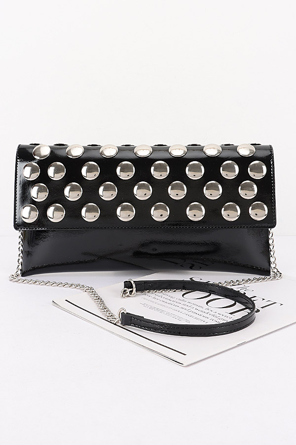 • * This Patent Leather Metal Studded Clutch from H&D Accessories features a sleek patent leather construction, adorned with evenly arranged metal studs that add a bold, stylish touch. It adopts a flap design, and is equipped with a detachable chain shoulder strap (for shoulder or crossbody wear) as well as a compact hand strap (for easy handheld carrying). The piece balances edgy details with practical versatility, making it a standout accessory for various outfits.Pair with a simple basic top + neat straight-leg pants, and comfortable flat shoes. Wear this clutch crossbody via the chain strap—it can hold small essentials like your phone and keys, while its studded design adds a eye-catching highlight to the minimalist outfit, fitting scenarios like supermarket runs or coffee dates.