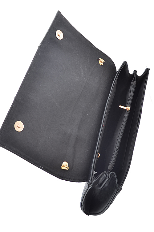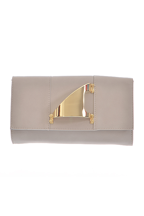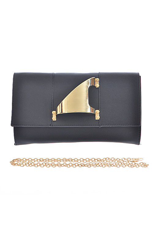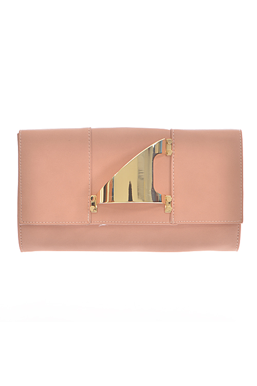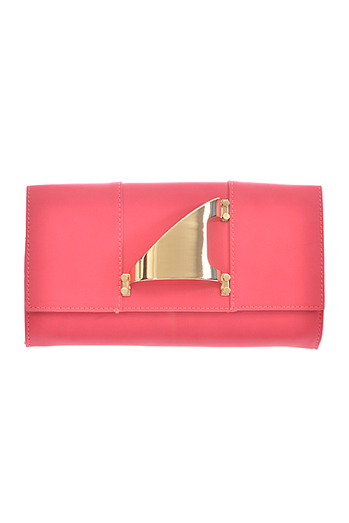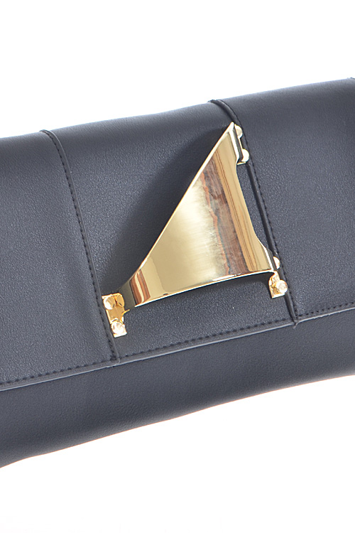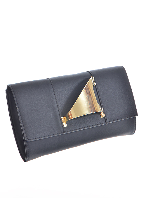 - * Clutch with Triangular Charm Detail * 11.5W*6.5H*1.5D * Polyurethane, mixed metal
