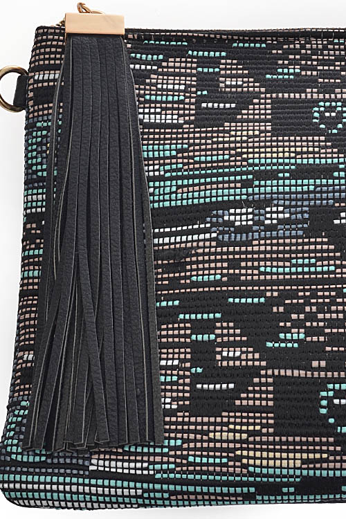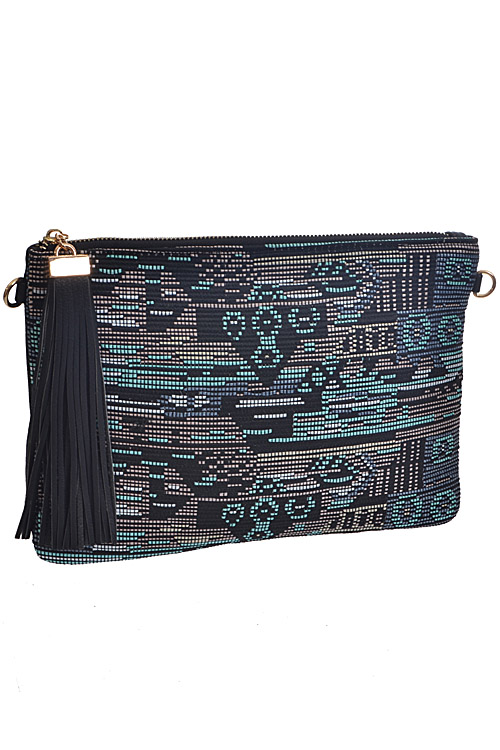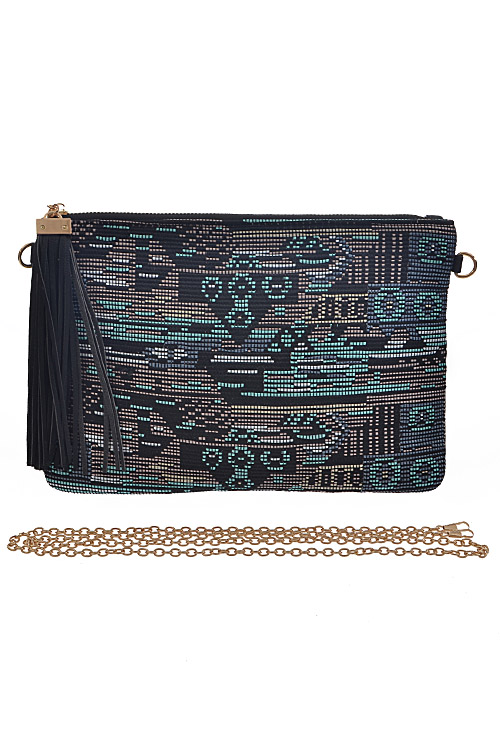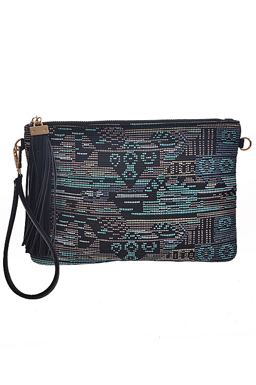• * Aztec Pattern Top Zip Clutch * 11.5W*8H * Polyurethane, mixed metal