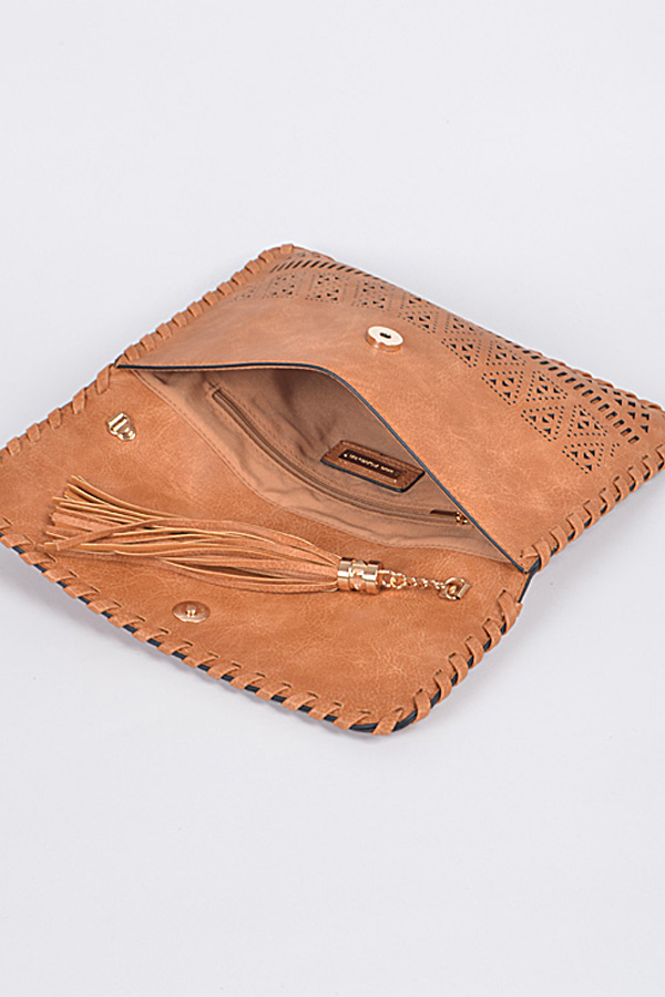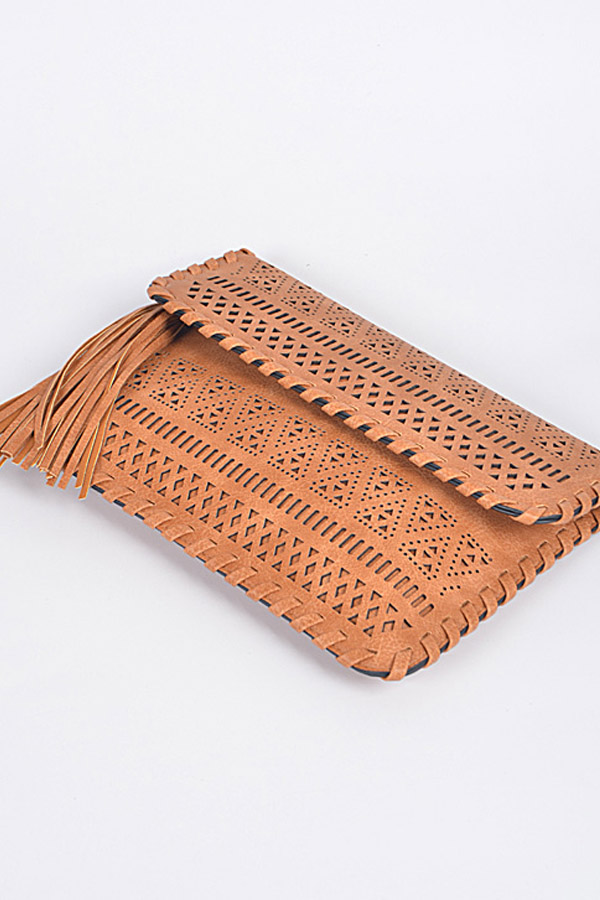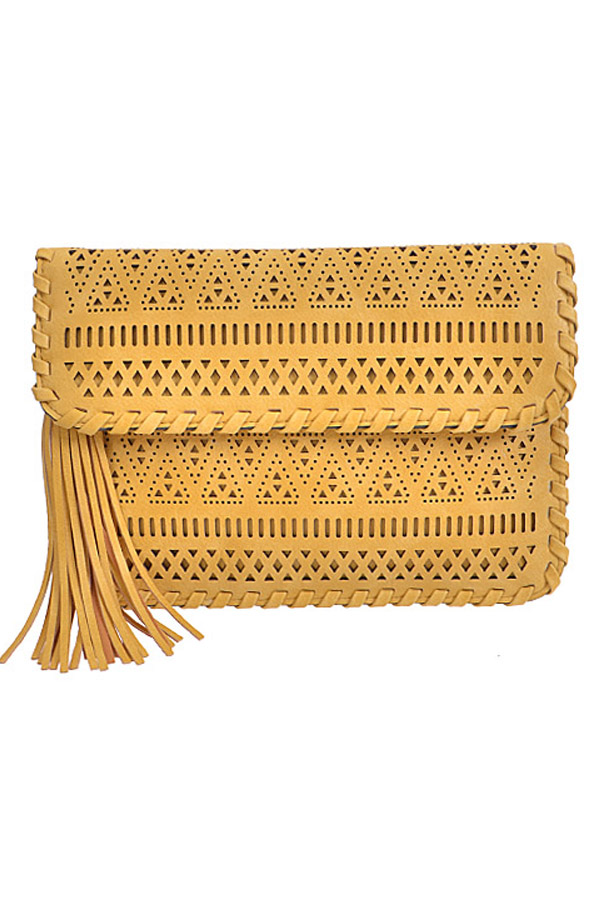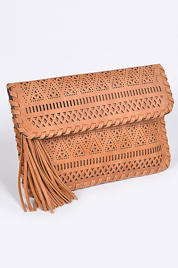 - * Aztec Cut Out Pattern Clutch with Fringe Detail