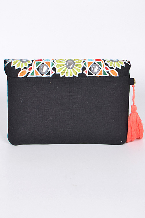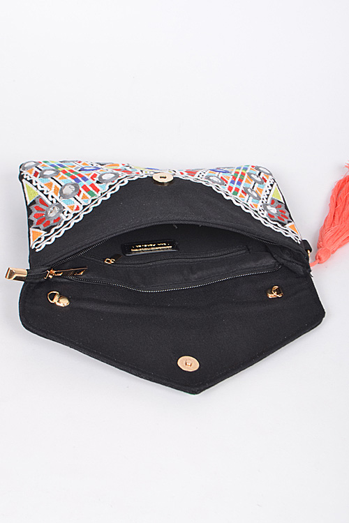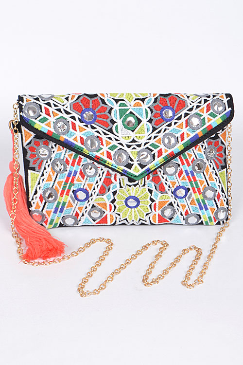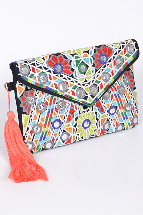 - * Hand Clutch With Intricate Pattern And Tassel Attachment