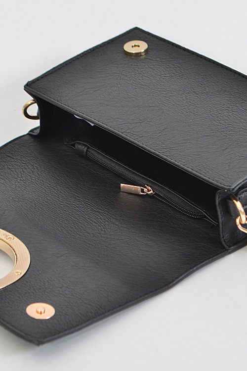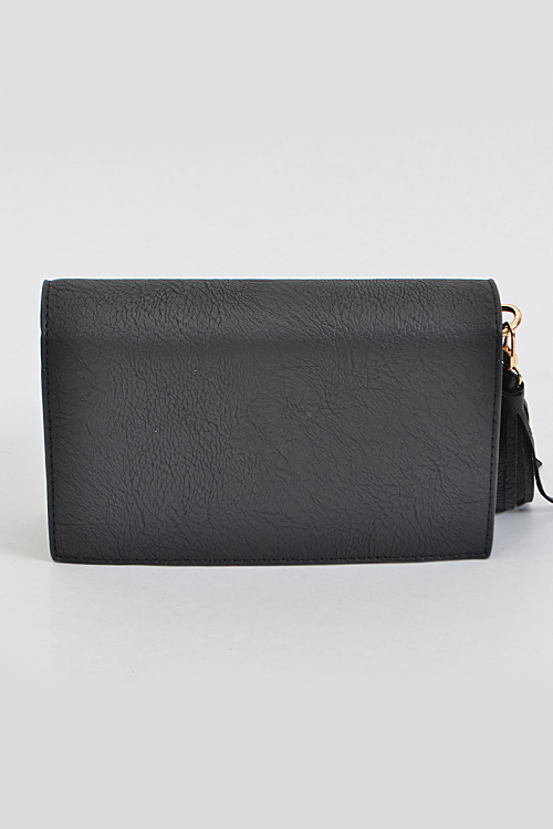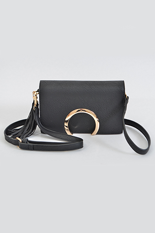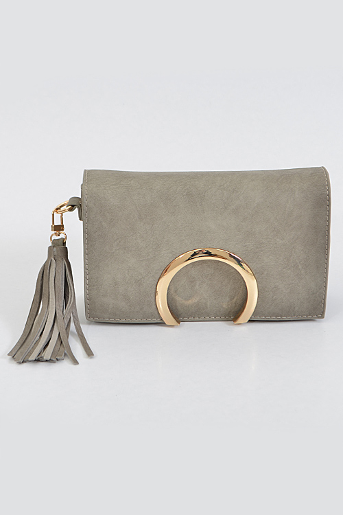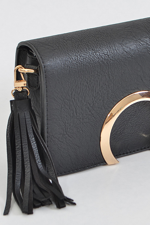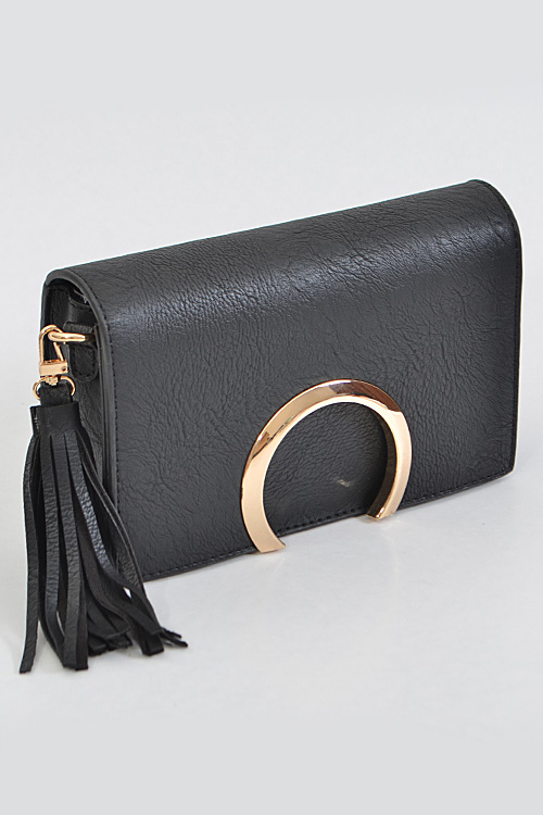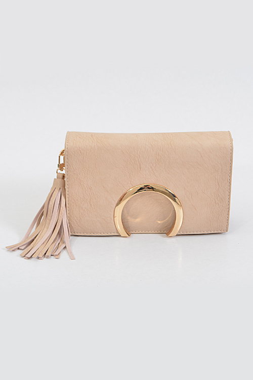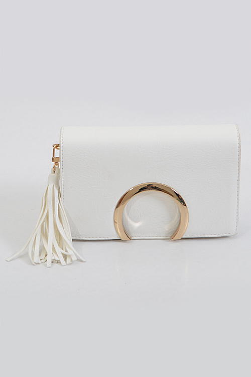 • * Simple Clutch With Half Crescent & Tassel * 8.25W*4.75H*2D * Polyurethane, mixed metal