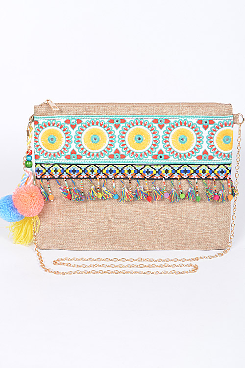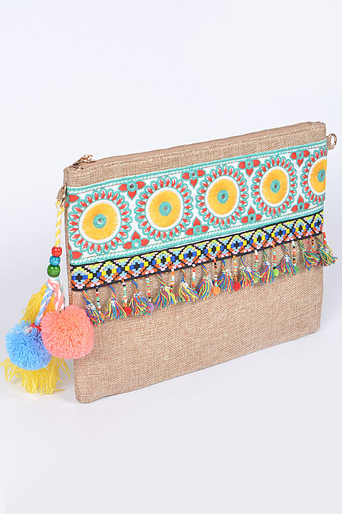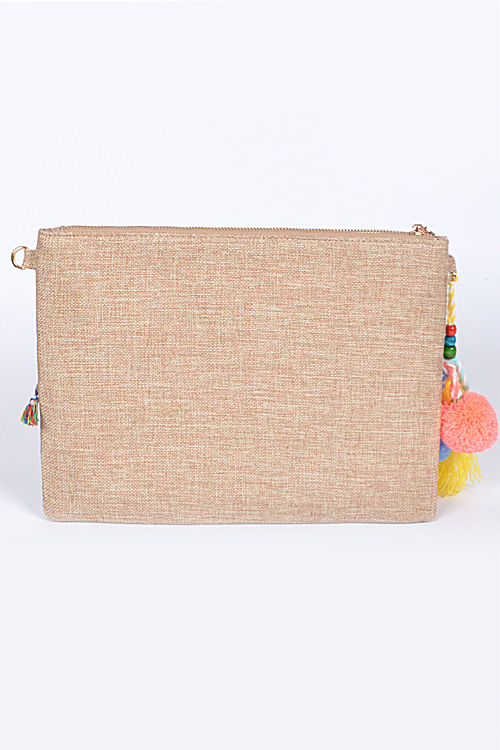 • * Aztec Inspired Colorful Clutch With Puff Balls * 12.25W*9.25H * Linen