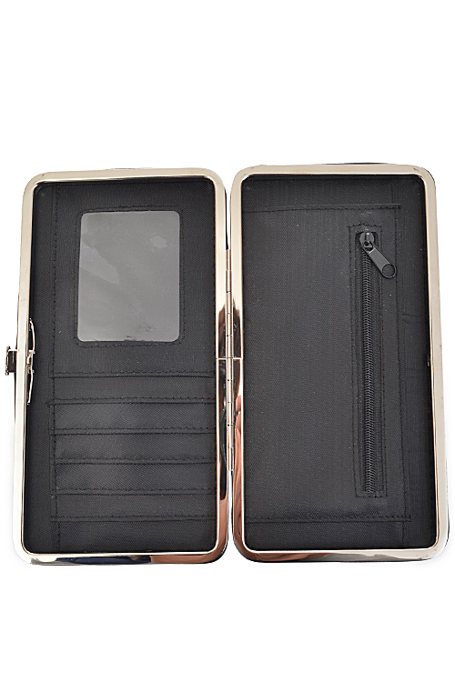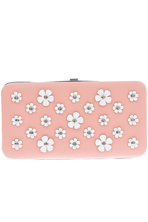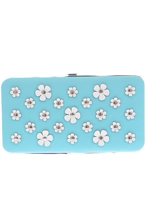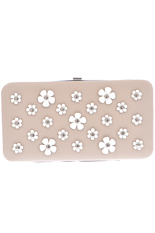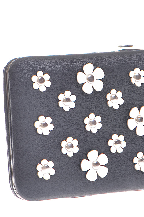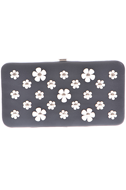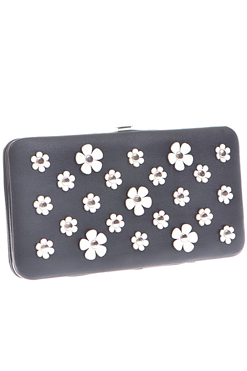 - * Flower Stud Attached Wallet * 7.5W*4H*0.5D * Polyurethane, mixed metal