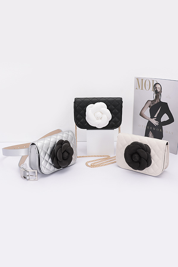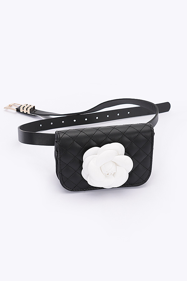 - * Meet the "Quilted Blossom Belt Bag" - a trendy and practical accessory that is perfect for on-the-go fashionistas. The faux leather material and shoulder chain add a touch of sophistication, while the flower embellishment adds a feminine touch.