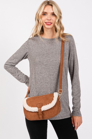 Fleece Trimmed Solid Crossbody Bag With Adjustable Strap