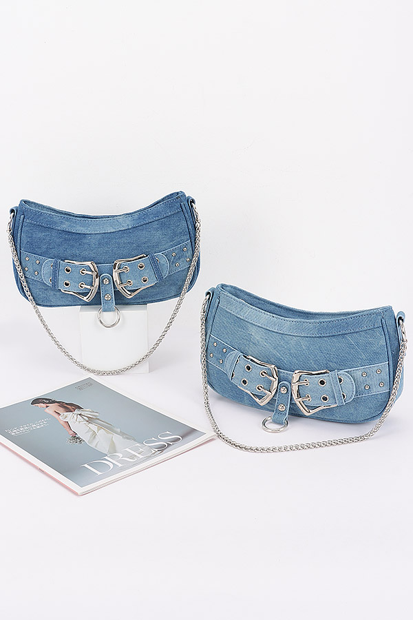 - * This is a Denim Crossbody Bag from H&D Accessories. Crafted from durable denim fabric, it features a sleek, curved rectangular silhouette with a structured shape. The front of the bag is adorned with two large, decorative metal buckles with intricate cut-out designs, complemented by small metal studs along the edges. A metal chain strap hangs from the bottom, adding an edgy touch, while the main shoulder strap is made of denim with metal eyelets for comfortable crossbody wear. The bag has a smooth, slightly faded denim finish, enhancing its casual, vintage-inspired look. Ideal for everyday casual outings, it pairs well with jeans, t-shirts, and casual dresses to add a stylish, laid-back flair.