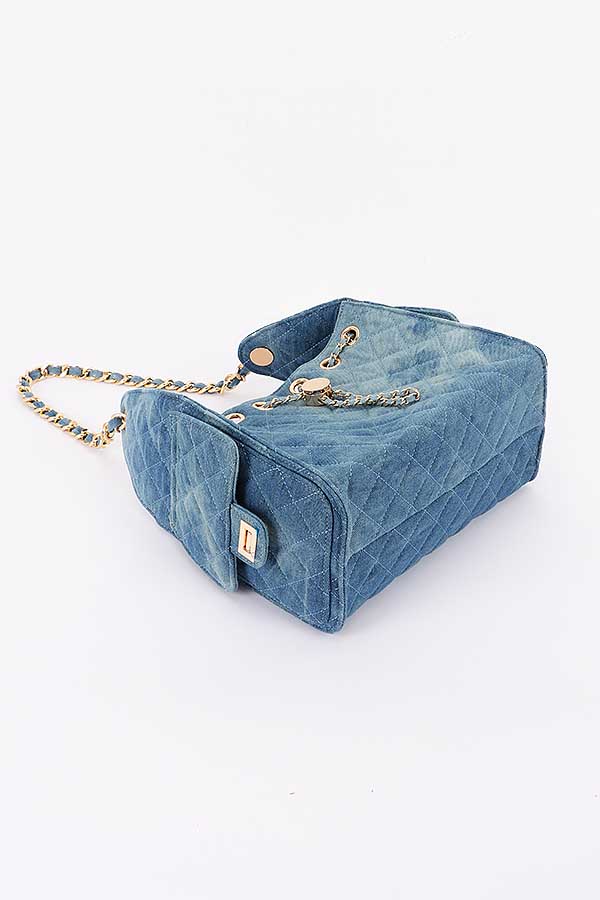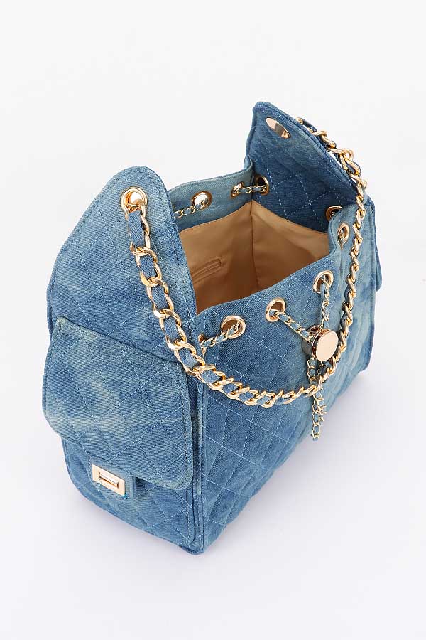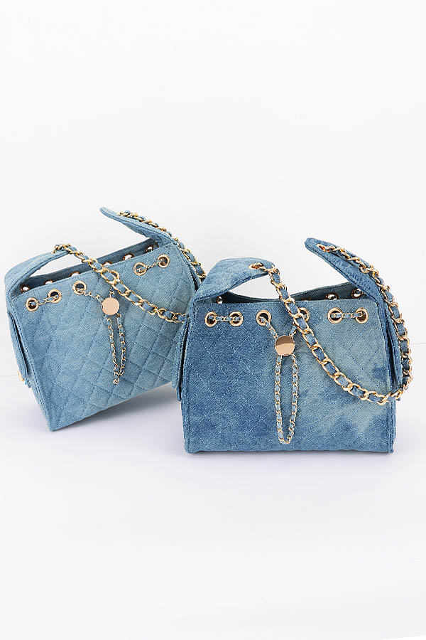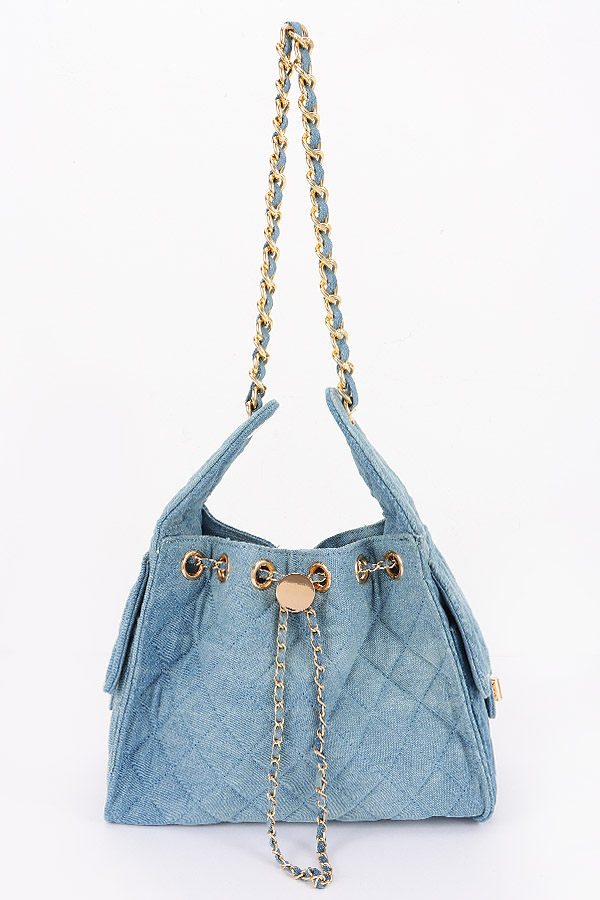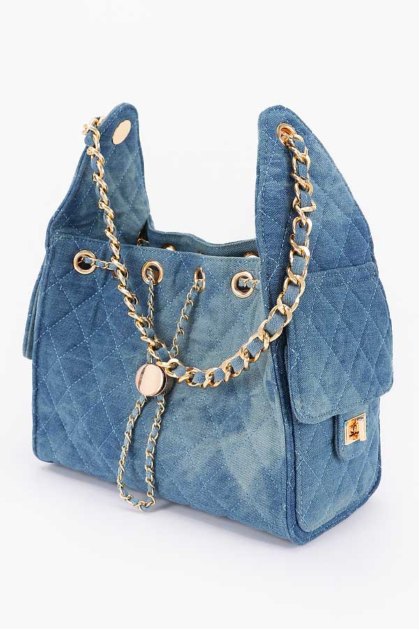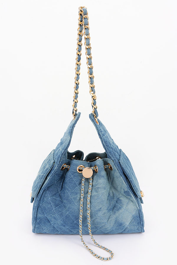 - * Quilted Denim Shoulder Bag from H&D Accessories showcases a quilted pattern and is equipped with gold - toned chain straps for elegant carrying. It adopts a drawstring closure with a circular metal detail, ensuring the security of essentials while enhancing aesthetic appeal. The silhouette, both structured and slouchy, provides sufficient room for daily necessities. Perfect for weekend getaways, brunch gatherings, or infusing a vintage - like charm into your daily ensembles, this bag seamlessly combines style and practicality.