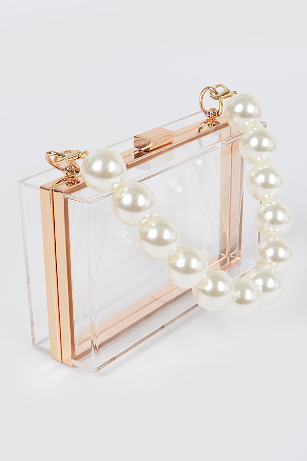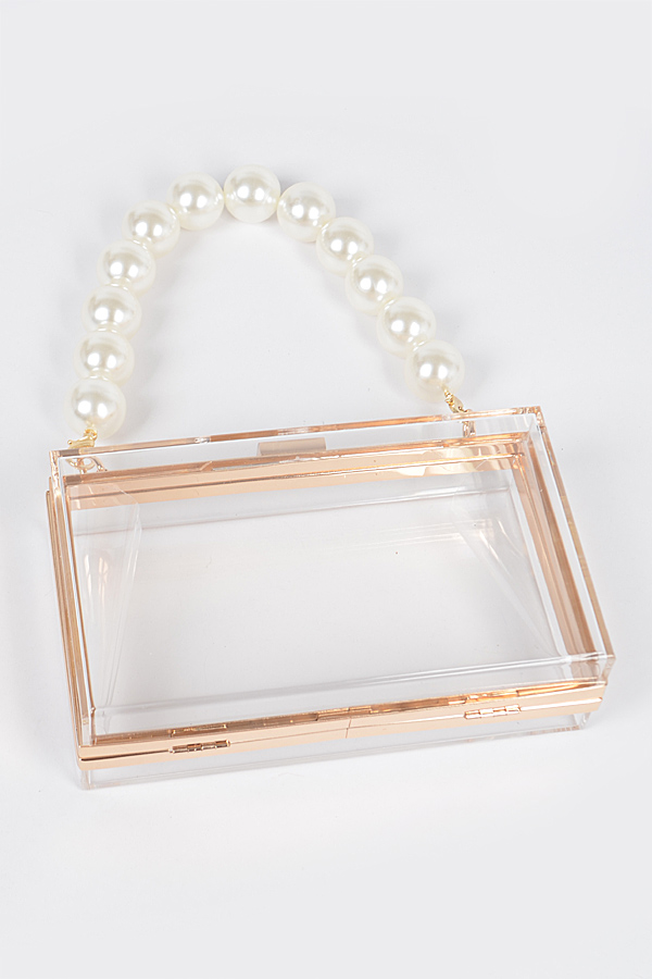 - * Discover the "Pearl Handle Transparent Frame Clutch" – where timeless elegance meets contemporary flair. This transparent frame clutch features a beautiful pearl handle and a stylish chain strap, making it an essential addition to your accessory collection. With H&D Accessories, you can shine bright at any event with this eye-catching piece.