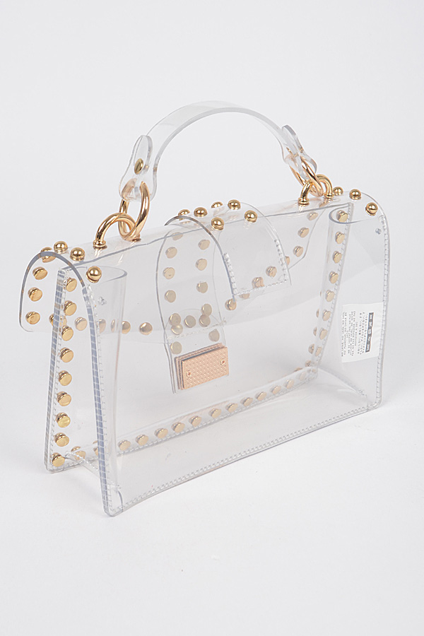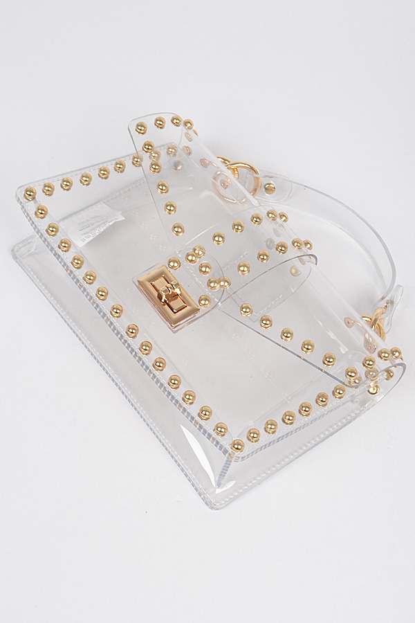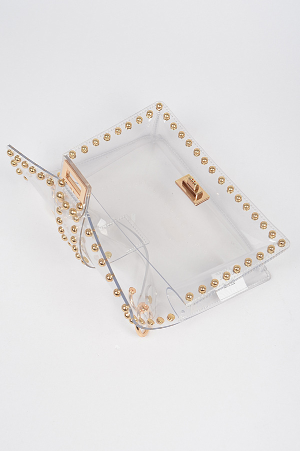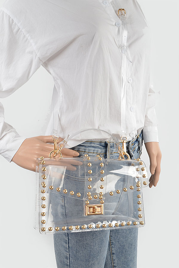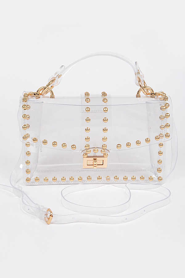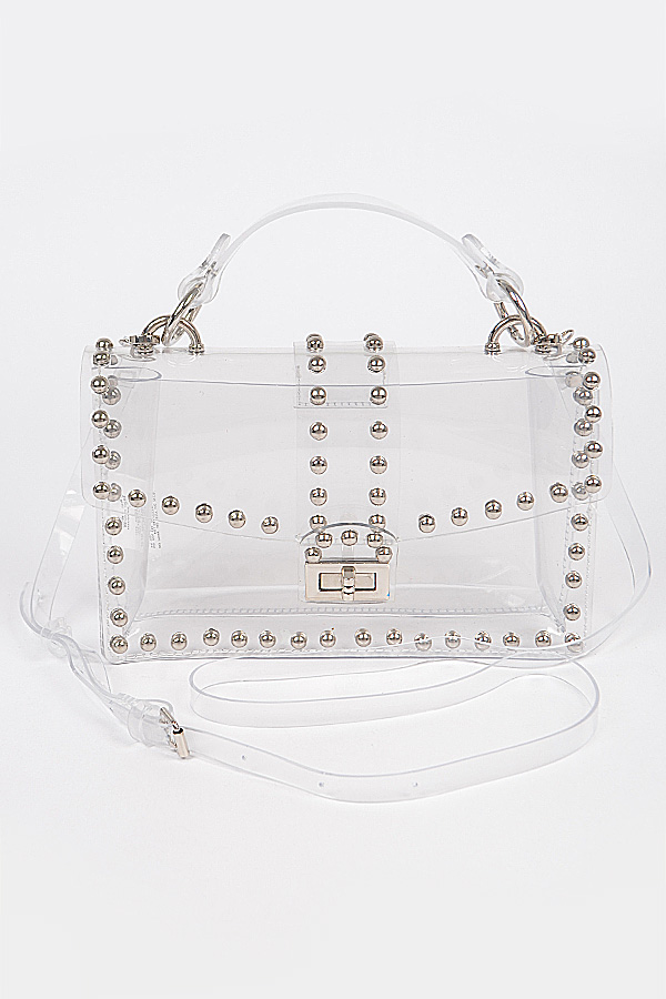- * This is a fashionable Round Metal Studded Transparent Crossbody Bag from H&D Accessories. It features a transparent body adorned with numerous round metal studs and a sleek metal lock, complemented by a transparent handle and an adjustable crossbody strap. This bag is ideal for adding a trendy touch to your summer outfits. You can carry it to a beach party, pairing it with a flowy sundress for a chic and breezy look, or use it for a casual day out shopping, where it not only holds your essentials but also makes a bold fashion statement. Its unique design effortlessly blends style and practicality, ensuring you stand out in any casual or semi-casual setting.