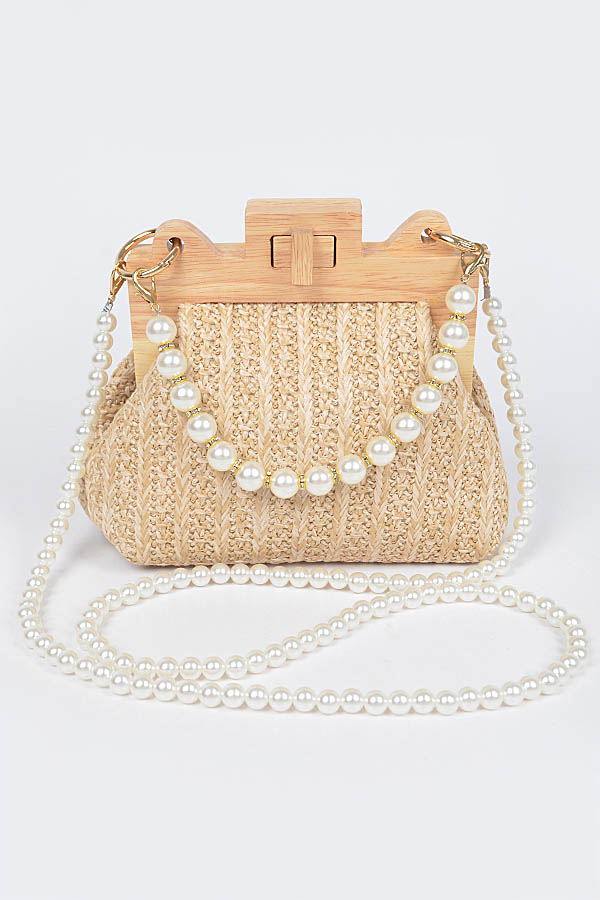 • * Faux Straw Wood Frame Clutch w/ Faux Pearl Chain
