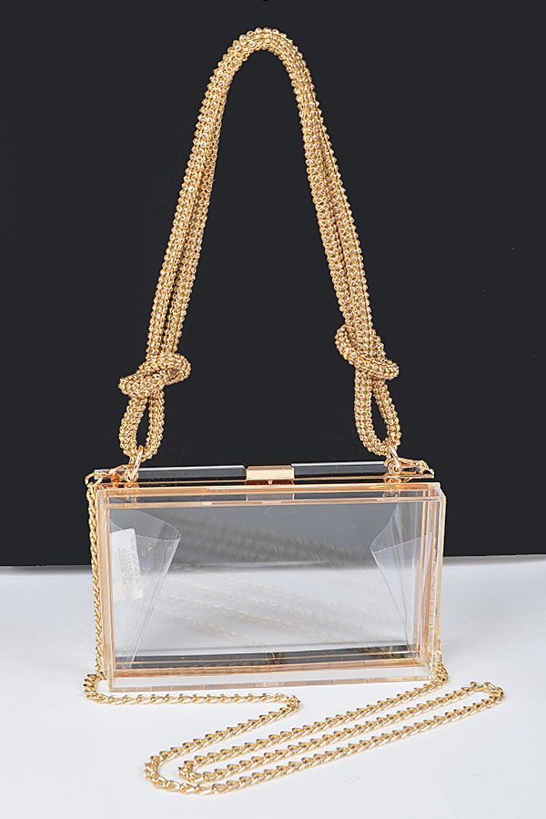 • * Introducing the "GlimmerBox Clutch" – a stunning clear bag that combines elegance and modernity. With its luxurious gold chain and sparkling rhinestone handle, this accessory is perfect for any occasion, allowing you to showcase your style while keeping your essentials secure. Elevate your outfit with the GlimmerBox Clutch and make a statement wherever you go.
