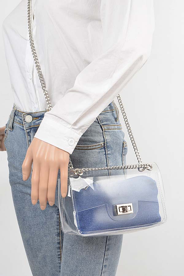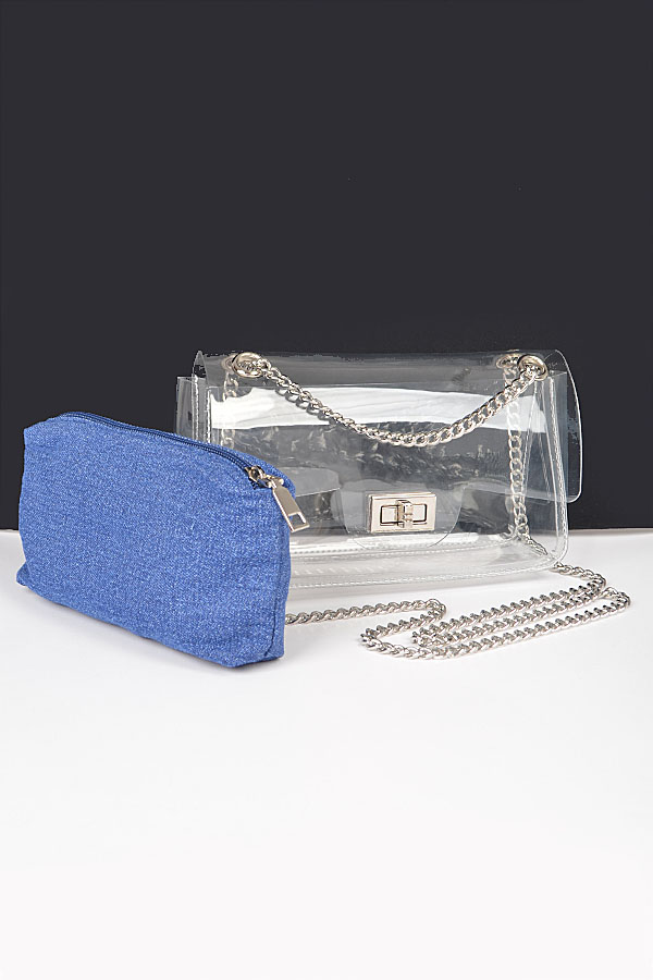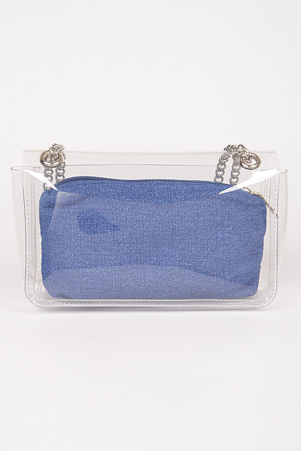 - * This Clear Bag w/ Denim Pouch from H&D Accessories is a trendy and functional accessory. It features a transparent outer bag with a sleek chain strap, allowing for easy visibility of its contents. Accompanied by a denim - textured pouch, it offers both style and practical storage options.