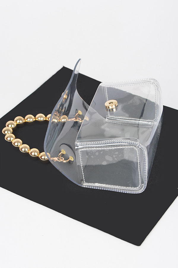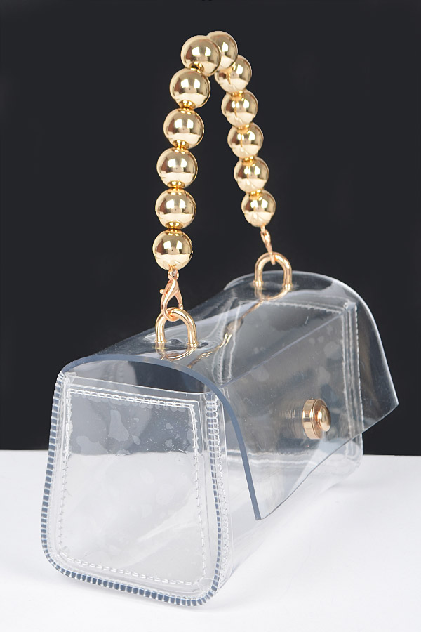 - * Elevate your style with the "Transparent CCB Handle Flap Clutch". This stunning transparent bag features a chic gold chain and elegant beads, making it the perfect accessory for any occasion. Stand out and shine with this eye-catching piece from H&D Accessories.