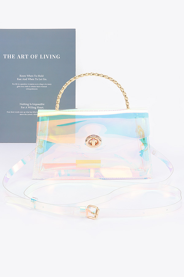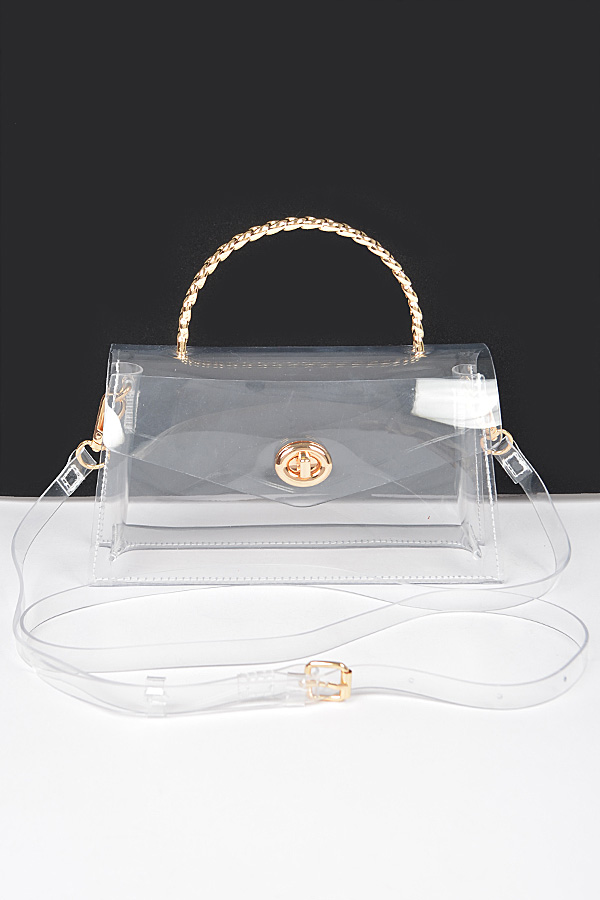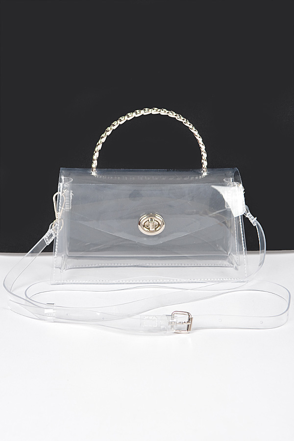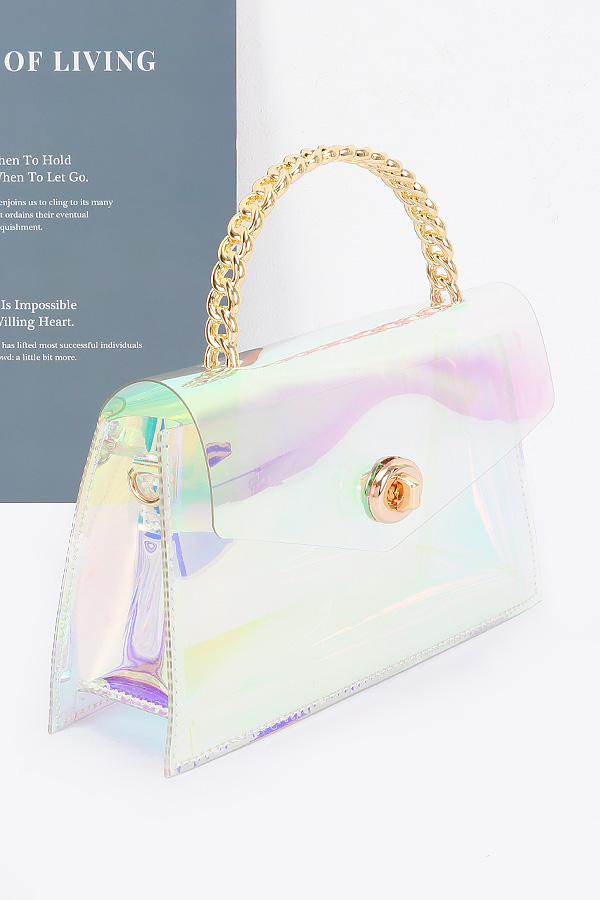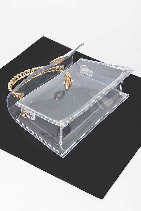 - * Elevate your look with the "Golden Luxe" bag - a stunning clear transparent clutch featuring a glamorous chain handle. Make a statement with this stylish accessory from Transparent Metal Handle Flap Clutch H&D Accessories.