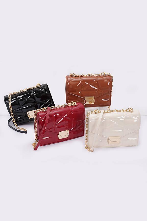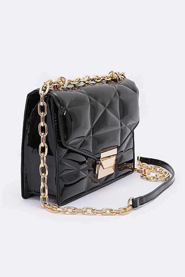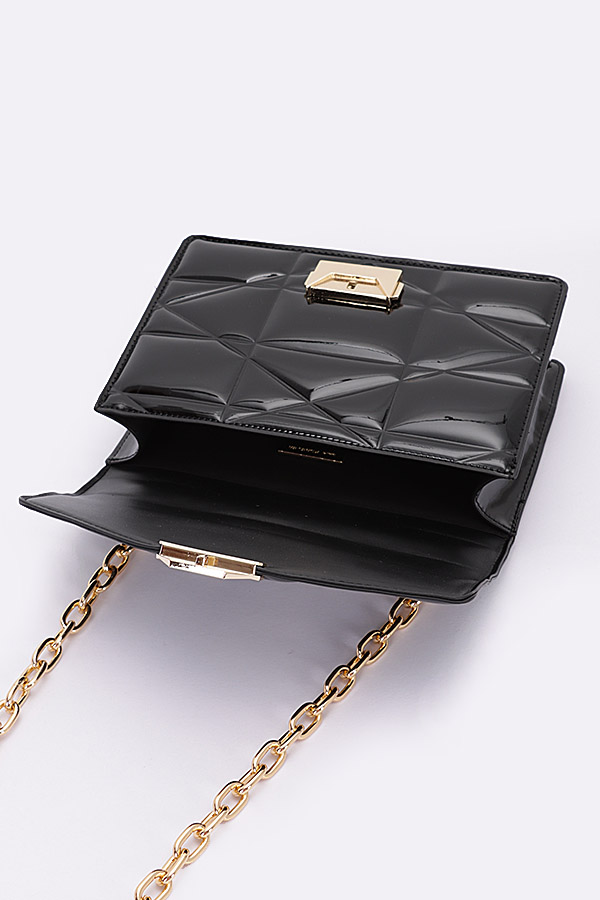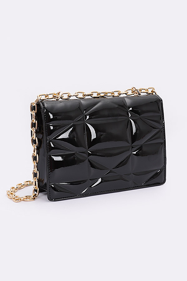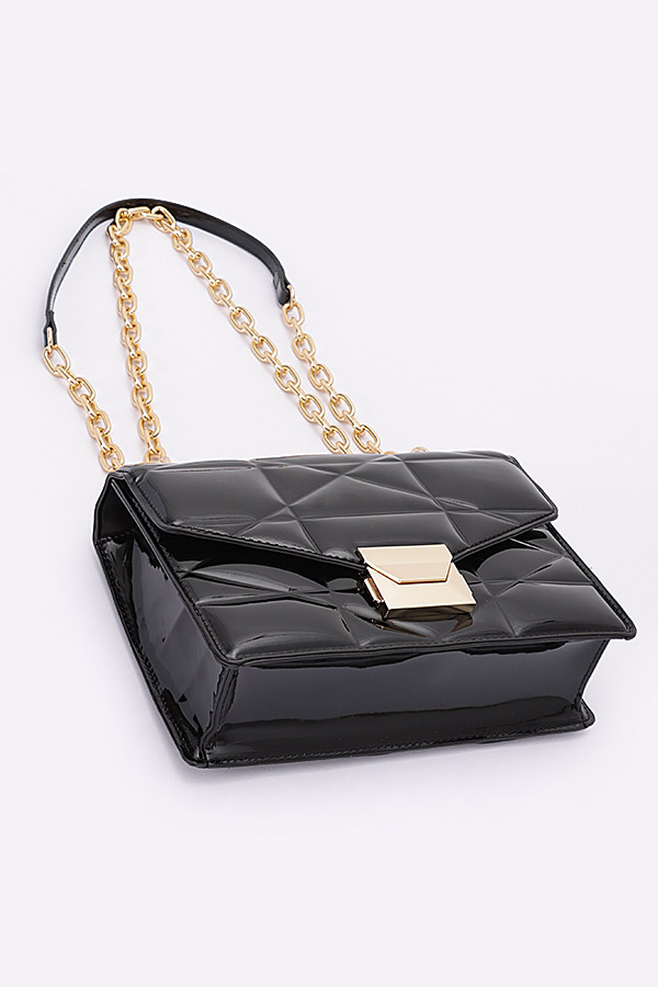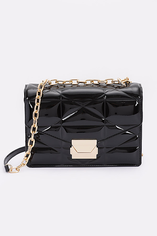 - * Introducing the "Enamel Elegance" - a patent clutch bag with a sleek gold chain. This exquisite handbag from H&D Accessories showcases an embossed enamel flap and a versatile crossbody design. The "Enamel Elegance" is a statement piece that exudes sophistication and style, making it the perfect accessory to elevate your ensemble.