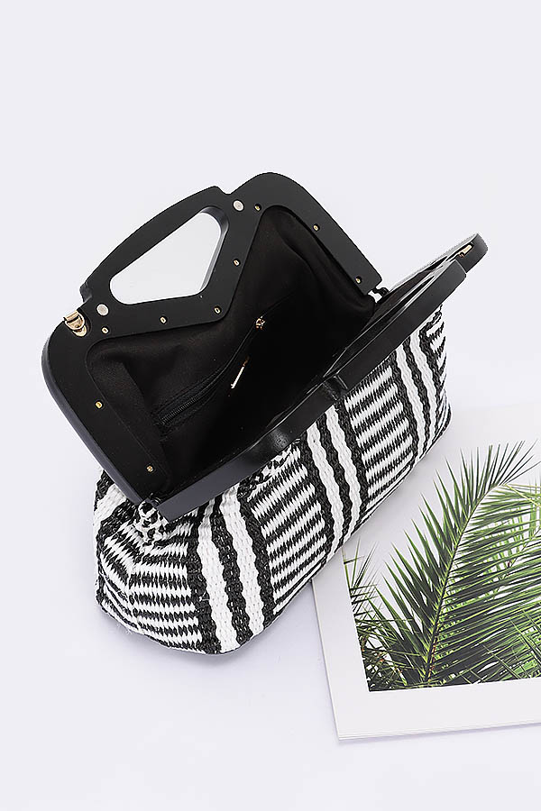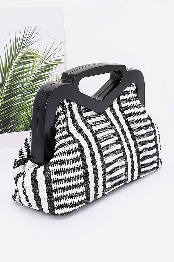 - * Meet the "Faux Straw Wood Frame Clutch" from H&D Accessories – the ultimate blend of sophistication and trendiness. This striped handbag features a unique faux straw wood frame and a chic chain, ensuring you stand out in any crowd. Elevate your style with this must-have accessory that complements both casual and formal outfits.
