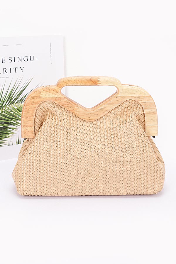 - * Introducing the "Natural Elegance Clutch" – a stunning woven bag that perfectly combines style and functionality. With its chic wooden handle, this faux straw accessory is the ideal companion for any occasion, adding a touch of sophistication to your outfit.