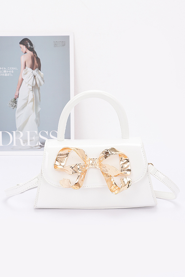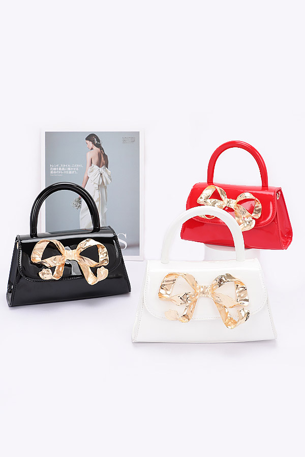 - * Introducing the "Faux Leather Metal Ribbon Top Handle Bag" – a stunning handbag that combines chic sophistication with a touch of glamour. The exquisite gold bow on the flap adds a unique flair, making it the perfect accessory for any occasion. Elevate your style with this faux leather masterpiece from H&D Accessories.