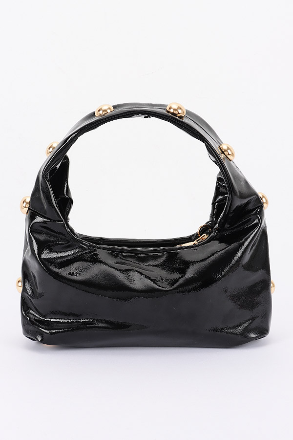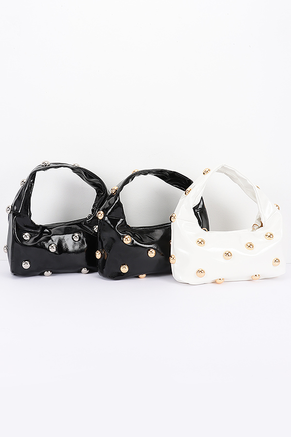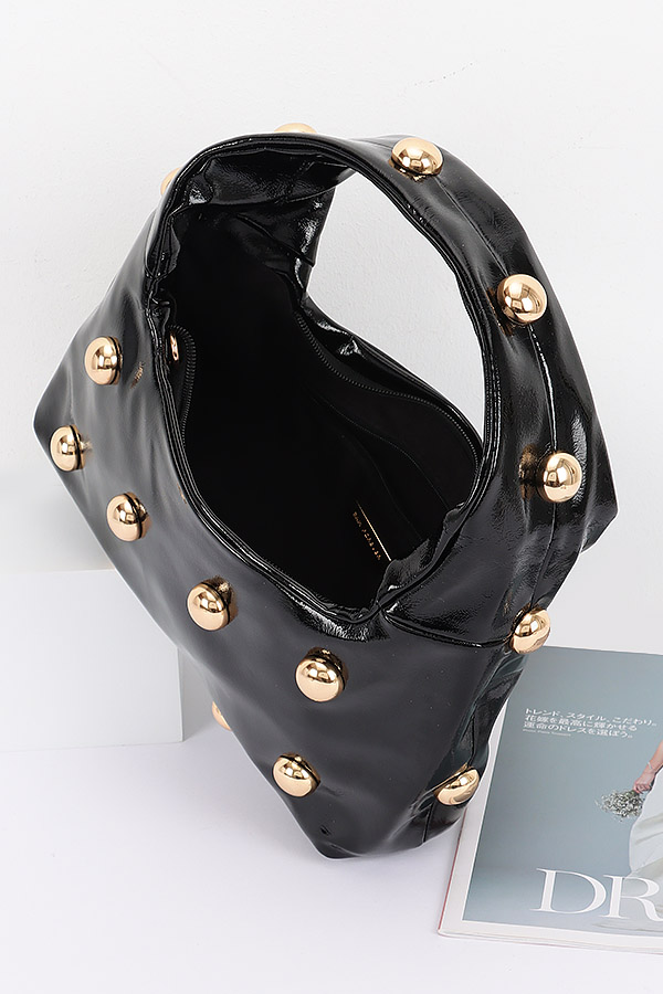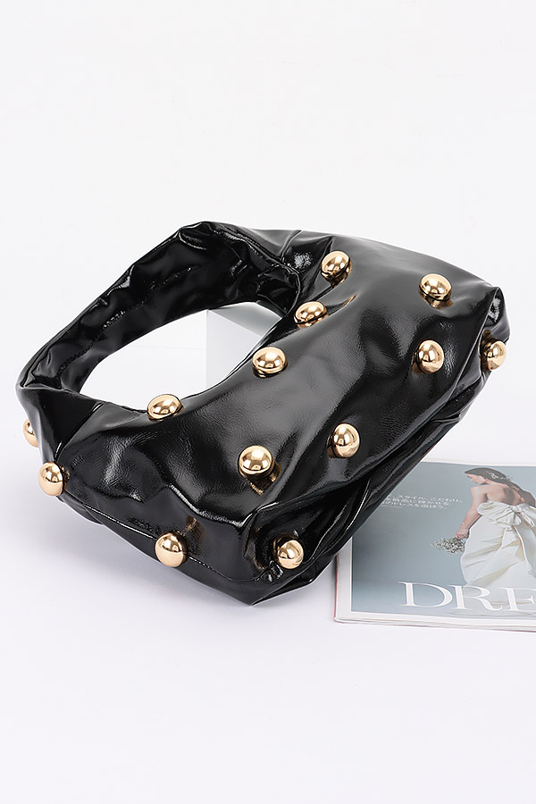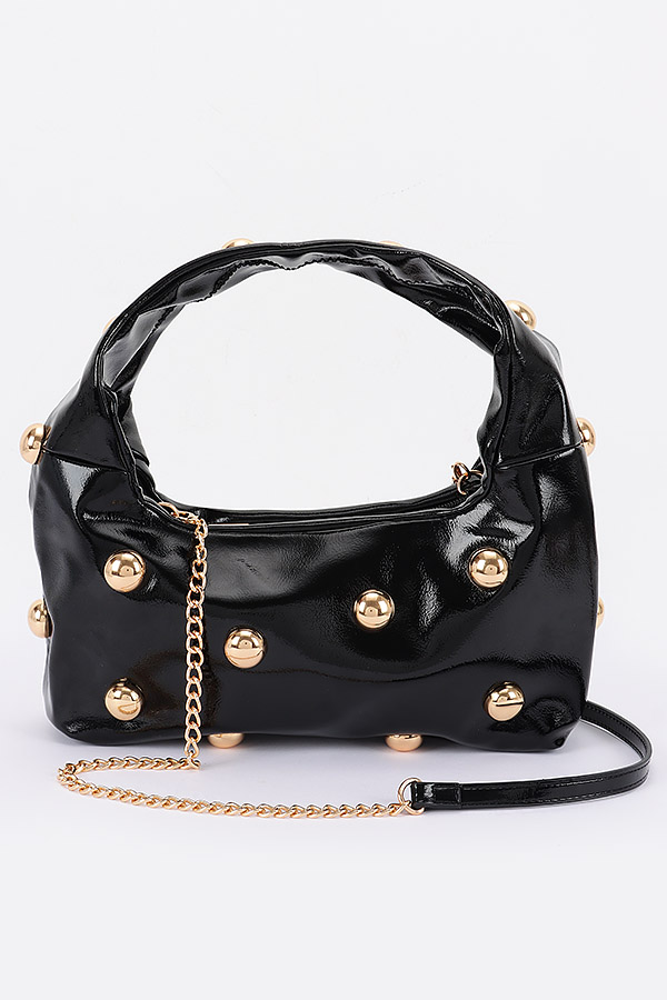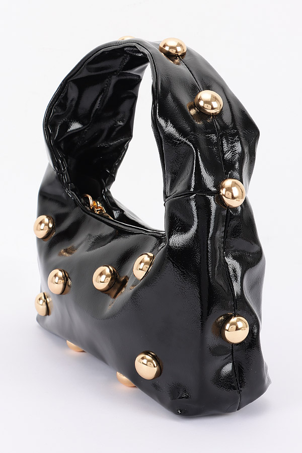 - * This Faux Leather Metal Studded Hobo Bag from H&D Accessories is a bold and fashionable accessory. It features a faux leather body with a shiny surface, adorned with multiple large, round gold - toned studs. The bag comes with both a gold chain shoulder strap and a black leather shoulder strap, offering versatile carrying options.