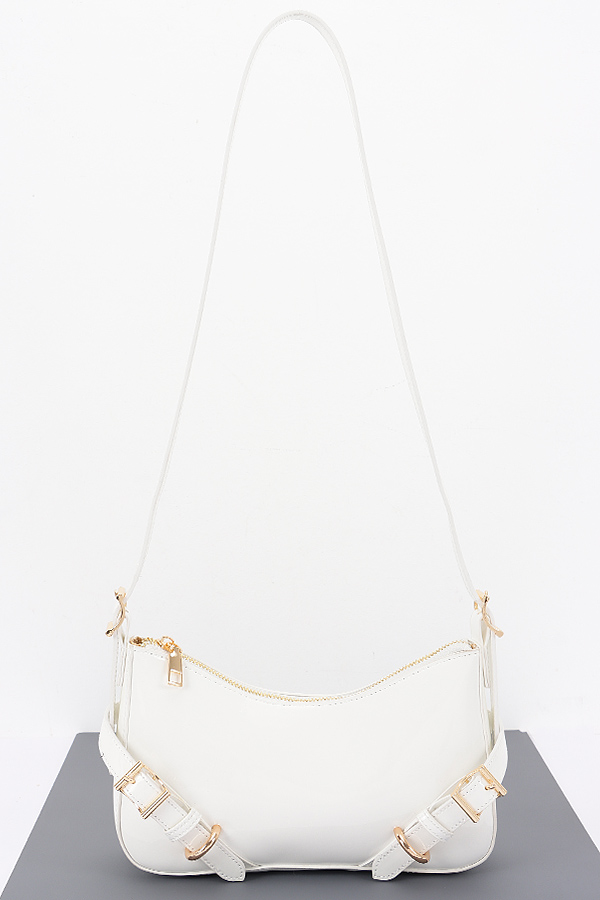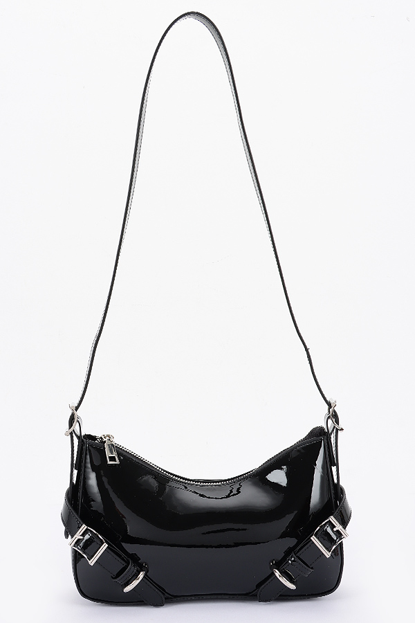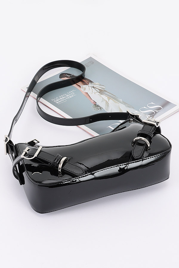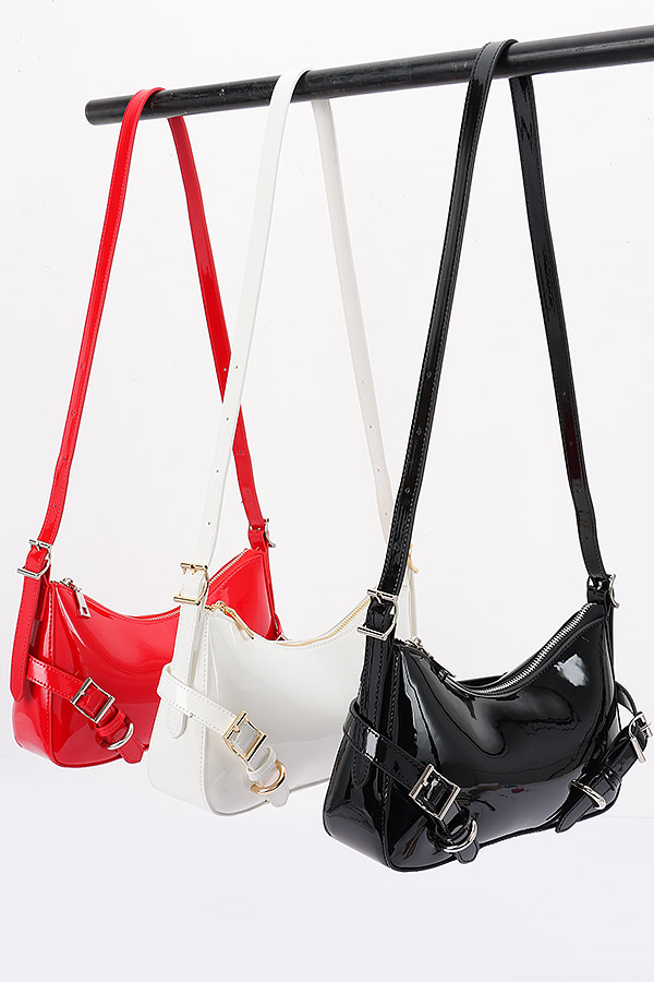 - * Enamel Faux Leather Multi Buckle Crossbody Bag