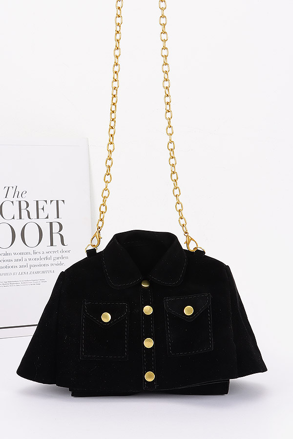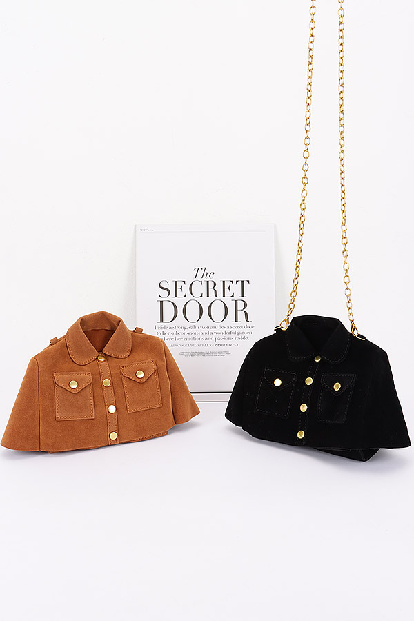 - * This Faux Suede Jacket Crossbody Bag from H&D Accessories is a unique and stylish accessory. It is designed to resemble a miniature jacket, crafted from faux suede with gold - toned buttons, giving it a fashionable and playful look. The gold chain strap adds a touch of elegance.