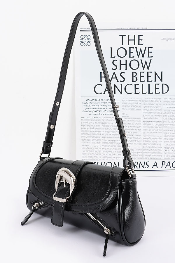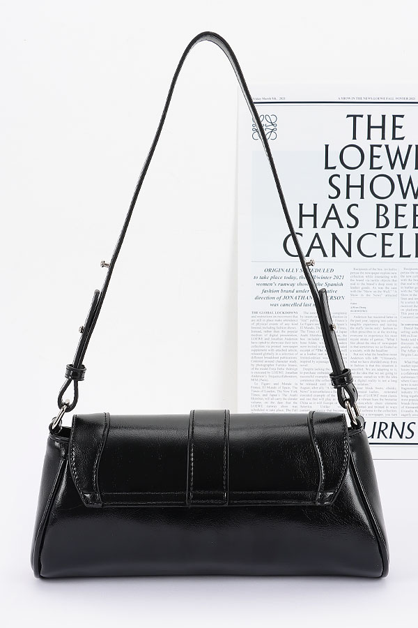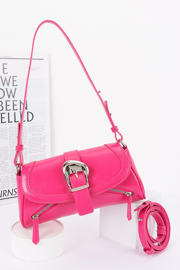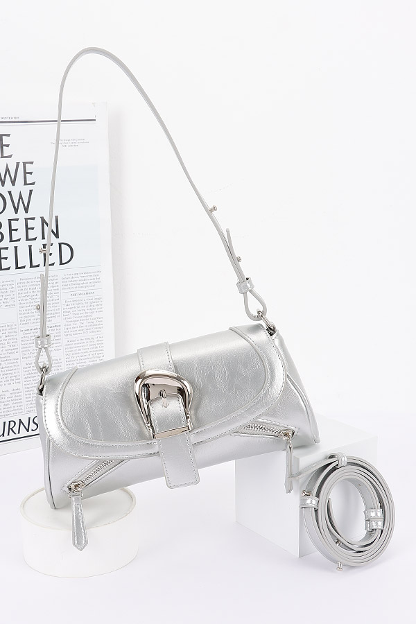 • * This Faux Leather Metal Buckle Flap Bag from H&D Accessories is a sleek and stylish accessory. It features a smooth faux leather exterior with a prominent metal buckle detail on the flap, adding a touch of sophistication. The bag also includes zippered compartments for practical storage and an adjustable strap for versatile carrying.