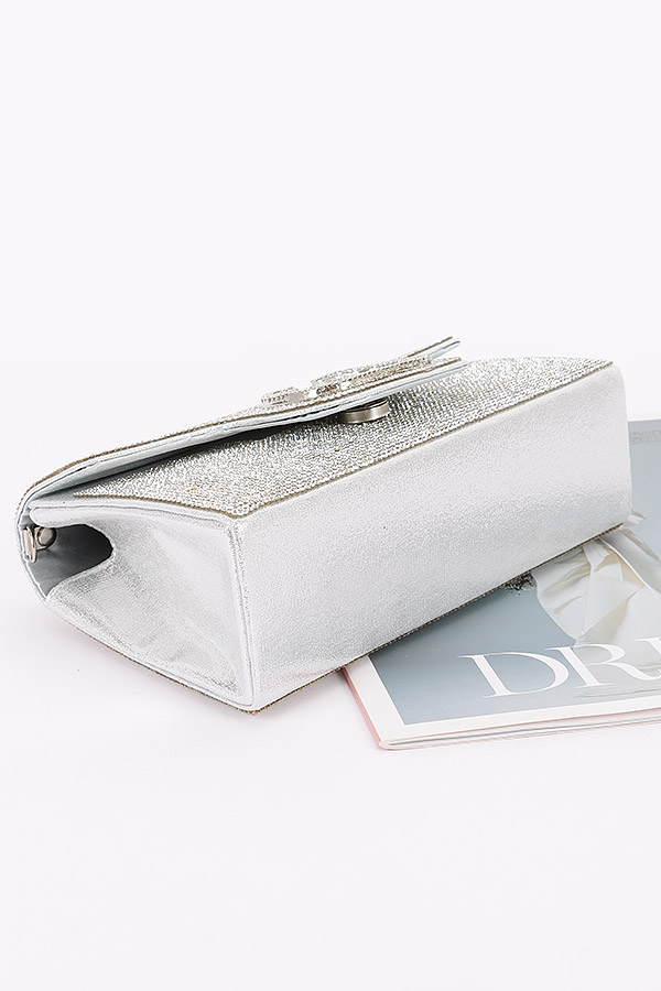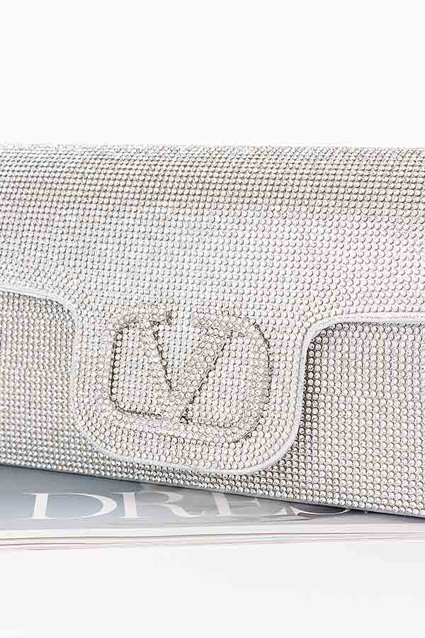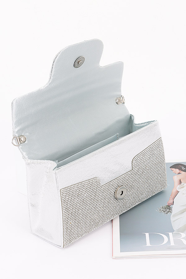 - * This is a Rhinestone Embellished Shoulder Bag from H&D Accessories. The bag is crafted with a sleek body covered in glistening rhinestones, creating a glamorous and eye - catching look. It features a decorative metal pattern on the front, adding an extra touch of sophistication. With both a thin chain and a wide shoulder strap, it offers multiple carrying options. In the background, there's a magazine showing an elegantly posed woman with an up - do in a white wedding dress.