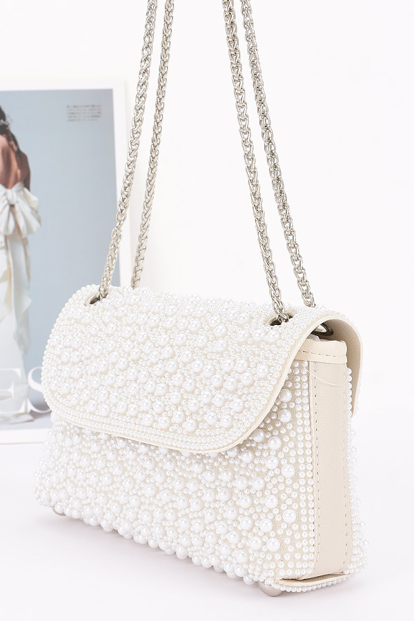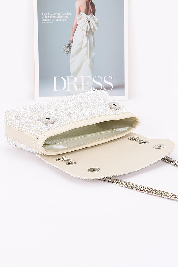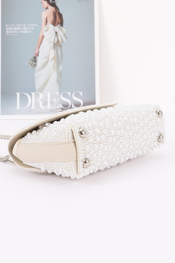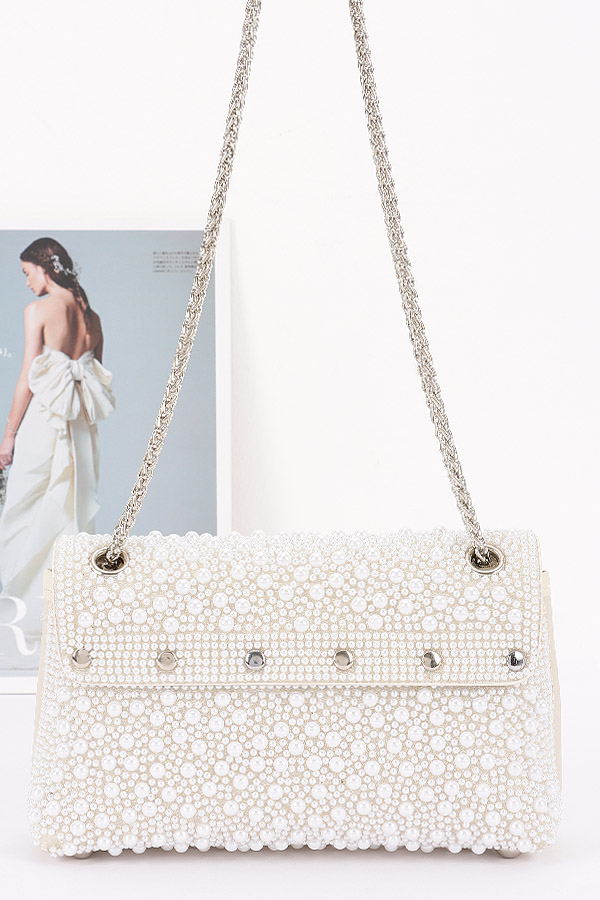 • * This is a Crystal Pearl Chain Shoulder Purse from H&D Accessories. The purse showcases a refined design with its body adorned by a combination of pearls and sequins, exuding a touch of luxury. The metal chain shoulder strap adds a modern and edgy element.