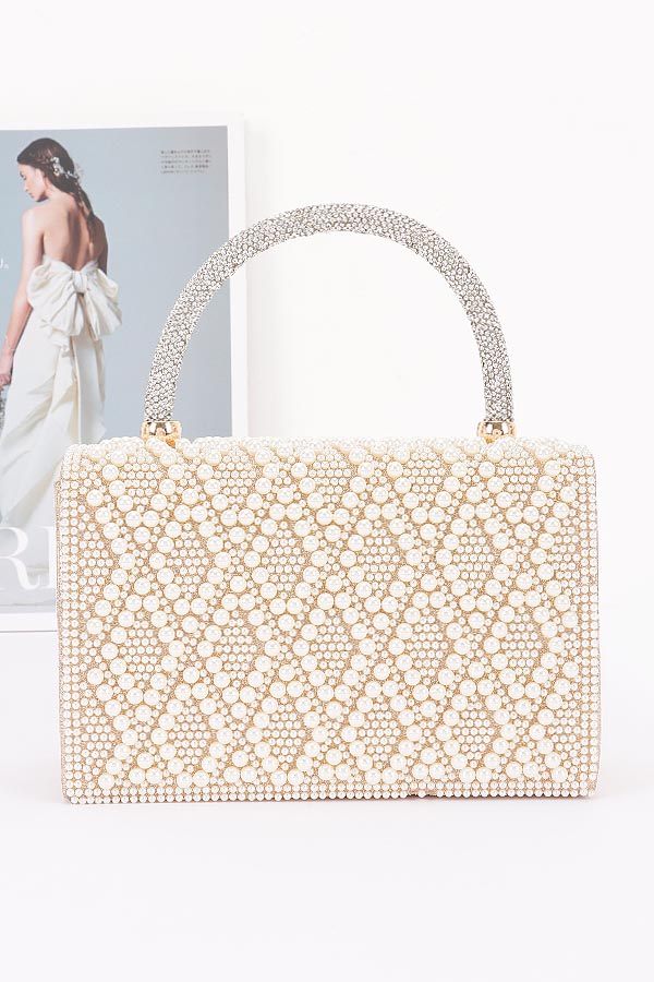 - * This Rhinestone - Handle Pearl Purse from H&D Accessories features a body meticulously adorned with pearls in a decorative pattern. It has a top handle encrusted with rhinestones for a touch of glamour, plus a detachable tone chain strap for versatile carrying.